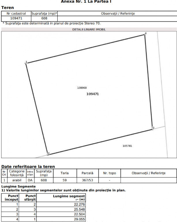 eren de Vânzare 608 mp- utilități (Apă, Gaz, Curent) Ofer spre vânzare un teren cu o suprafață de 608 mp, ideal pentru construirea unei locuințe sau a unui proiect rezidențial. Terenul este amplasat într-o zonă liniștită, dar totodată ușor accesibilă, fiind aproape de principalele artere de circulație, magazine și alte facilități importante. Suprafață: 608 mp Utilități: Apa, gaz, curent electric toate disponibile la teren Certificar de urbanism: -Destinatie locuinte individuale cuplate cu regim de inaltime maxim P+2 -POT: 30% -CUT: Parter-0,3 , P+1 - 0,6 , P+2- 0,9 Accesibilitate: Terenul beneficiază de un acces rapid la drumuri asfaltate și transport în comun, acesta are acces la două străzi, oferind mai multe opțiuni pentru organizarea construcției. Destinație: Ideal pentru construcția unei case familiale sau a unui proiect mic de dezvoltare rezidențială. Preț: 55000 Aceasta este o oportunitate pentru investitori sau persoane care doresc să construiască într-o zonă în dezvoltare, cu acces la utilitățile necesare (apa ,gaz,curent) Mențiune: Nu doresc colaborare cu agențiile imobiliare.