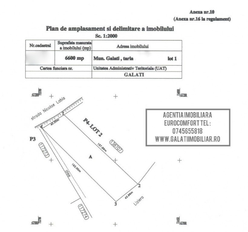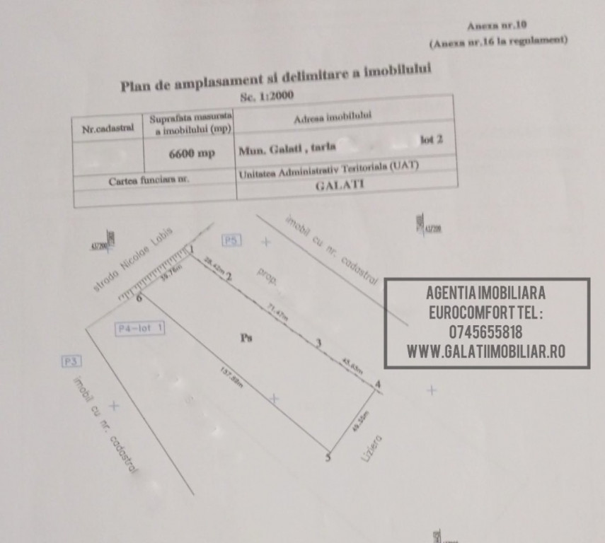 Descriere Generală: Vă propunem spre vânzare, în reprezentare exclusivă, un teren intravilan generos situat în Municipiul Galați, cartierul Barboși, pe strada Nicolae Labiș. Poziționat într-un cadru natural deschis, în apropierea luncii Siretului, terenul reprezintă o oportunitate excelentă de investiție, având un preț competitiv de 30 Euro/mp. Suprafață și Configurație: Proprietatea se remarcă printr-o suprafață amplă și o configurație ideală pentru diverse tipuri de proiecte: Suprafață parcelă: 6.600 mp. Deschidere: Front stradal generos de 40 ml la un drum de acces pietruit, ceea ce facilitează accesul utilajelor de mari dimensiuni sau o eventuală parcelare. Posibilitate de extindere: Există opțiunea achiziționării lotului alăturat (lipit), având aceeași suprafață de 6.600 mp și deschidere similară, ajungându-se astfel la o suprafață totală compactă de 13.200 mp. Utilități și Infrastructură: Terenul este liber de construcții, perfect plan și pregătit pentru demararea lucrărilor. Rețelele de utilități (curent electric și apă potabilă) se află în imediata proximitate, la o distanță de aproximativ 50 de metri de limita proprietății. Accesul se face din drum pietruit, zona fiind ușor accesibilă auto. Potențial de Dezvoltare (Multiple Destinații): Datorită poziționării strategice și a suprafeței mari, terenul este extrem de versatil: Industrial / Logistică: Configurația plană și deschiderea mare îl fac ideal pentru construcția de hale, depozite sau spații de producție ușoară. Agrement și Turism: Proximitatea față de râul Siret și zona de "Lizieră" (pădure) menționată în planul cadastral oferă un cadru perfect pentru un complex turistic, zonă de camping, pescuit sau bază de agrement. Rezidențial: Zona liniștită, ferită de agitația urbană și poluare, este pretabilă pentru parcelare în vederea construirii de locuințe individuale sau a unei case de vacanță cu domeniu vast. Situație Juridică: Proprietatea dispune de toate actele la zi, intabulare și documentație cadastrală (Plan de Amplasament și Delimitare recepționat), fiind pregătită pentru tranzacționare imediată. Preț: 30 Euro/mp. Vă invităm la vizionare pentru a identifica cel mai bun mod de a valorifica acest teren cu potențial imens!
