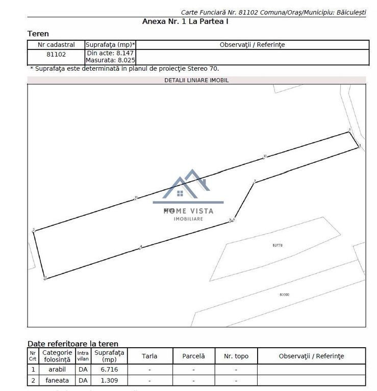 Home Vista Imobiliare vă propune spre vânzare un teren intravilan cu suprafața de 8147 mp, situat în comuna Băiculești, sat Argesani, jud. Argeș. Caracteristici: Suprafață totală: 8147 mp Categoria: intravilan Teren neîmprejmuit, cu acces direct la drum Ideal pentru parcelare, locuințe individuale sau dezvoltare agricolă Avantaje zonă: Acces rapid către Curtea de Argeș (10 minute) și către Pitești (25 minute) Zonă liniștită Potrivit pentru investiții pe termen lung Proprietate intabulată, acte la zi, disponibilă imediat pentru vânzare.