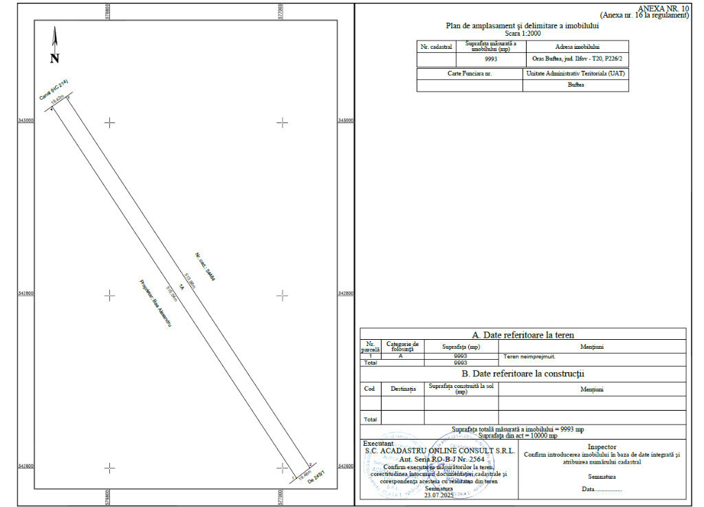 De vânzare teren intravilan situat în orașul Buftea, județul Ilfov, cu o suprafață totală de 9.993 mp (conform măsurătorilor cadastrale). Terenul este neîmprejmuit, amplasat într-o zonă în care se va dezvolta in viitor, pe partea stanga a drumului dintre Buftea si Corbeanca (directia spre Corbeanca). Pret 15 euro mp