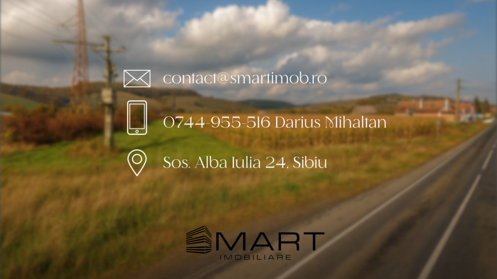 Smart Imobiliare vinde un teren intravilan, curti constructii si cu CU la iesire din Cristian catre Sacel. Terenul are o deschidere de 40ml la DN si se poate face diverse activitati, fiind pretabil in cea mai mare parte pentru dezvoltare rezidentiala.