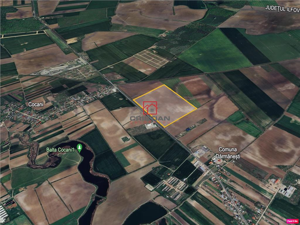 Vanzare teren intravilan Crevedia - DN1A, Dambovita. Proprietatea este compusa din teren intravilan, suprafata 150.000mp(15Ha), deschidere 300ml la DN1A - Bucuresti - Ploiesti, localizat la circa 700 ml din satul Cocani. Terenul se preteaza pentru construire cladiri cu destinatie: agrement, rezidentiala, industriala, comerciala. Pret vanzare - 3.750.000euro COMISION AGENTIE 3%