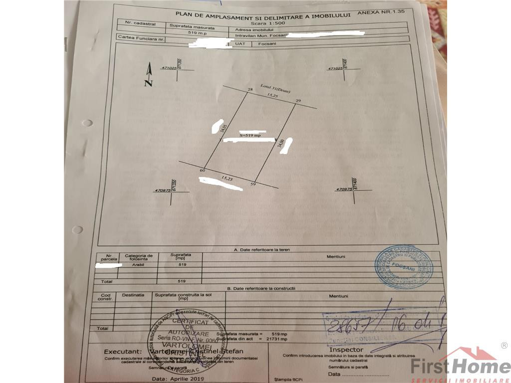 Teren Intravilan Construibil de vanzare in Focsani - Exterior Nord, reper Cartier Cuza Voda - Livada, avand o suprafata de 1.039 mp si deschiderea de 30 metri liniari. Terenul este compus din doua loturi de 520mp fiecare ! Se poate vinde si separat ! Pretul este usor negociabil . ID intern: 1074.