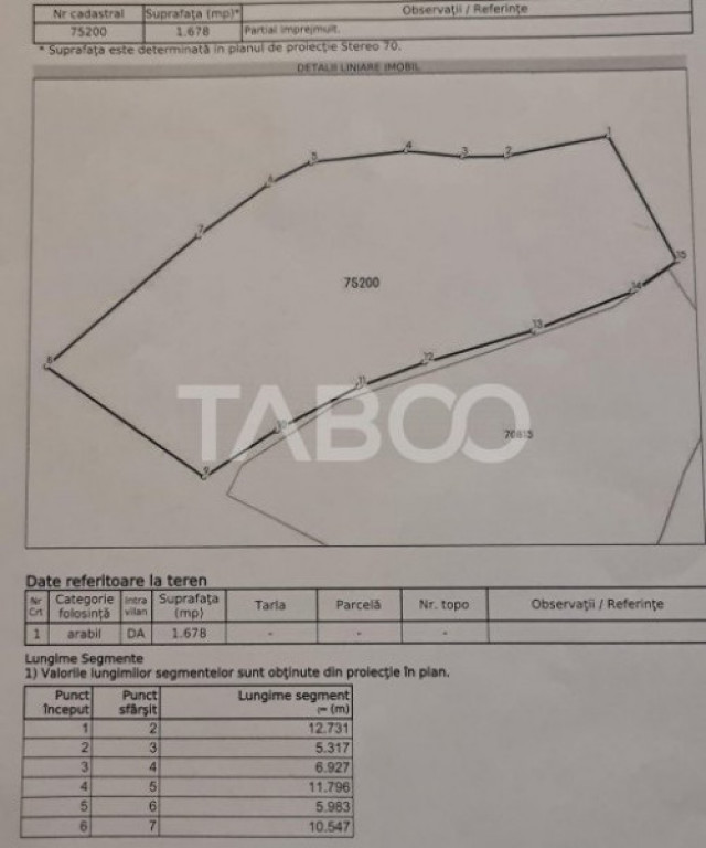 OCAZIE! Teren intravilan in suprafata de 1678 mp de vanzare in Sasciori, jud Alba. Vand teren intravilan in suprafata de 1678 mp situat într-o zonă deosebita, perfect pentru constructii rezidentiale sau proiecte comerciale. Suprafata este impartita pe două platforme distincte, legate armonios printr-o pantă lină, ceea ce oferă oportunități variate de amenajare și arhitectură. Caracteristici: Utilităti:apă, gaz, curent electric. Acces:Are deschidere la 2 drumuri - la Transalpina, sosea asfaltata-18 ml si la un drum pietruit - 23 ml Topografie: Teren cu 2 parti plane, perfecte pentru constructii, și o panta care oferă caracter și posibilitate de amenajare peisagistica. Zonă:Se afla in mijlocul Comunei Sasciori, la poalele Vaii Sebesului, cu priveliste superba asupra dealurilor din imprejurimi. Utilizare: Ideal pentru constructia de case individuale, duplexuri, pensiuni, activitati comerciale. Terenul ofera un potential unic datorita celor doua platforme, permitand separarea zonelor functionale (ex: casa si gradina, parcare si spatiu locuibil, etc.). Pret: 39.900€ Cod ofertă / ID: P19656 Sună-ne acum la 0369.822.820 și află detalii despre această proprietate de vanzare din Sasciori, dar și despre alte proprietăți potrivite pentru tine. Informatii speciale: 1. Descarcă aplicația pe mobilul tau "TABOO Imobiliare" din Apple Store, Google Play sau Huawei AppGallery pentru a afla instantaneu noile proprietăți care intră pe piață. 2. Dacă ai o proprietate pe care vrei să o vinzi sau să o închiriezi, suntem aici pentru tine! Contactează-ne pentru o evaluare gratuită fără obligații și vei descoperi avantajele de a lucra cu o echipă dedicată și experimentată. 3. Dacă vrei sa incepi o cariera de agent imobiliar, suna la 0369.822.820 si programeaza o intalnire pentru a afla toate beneficiile si avantajele. Intră pe TABOO.ro și descoperă cele mai recente oferte, actualizate zilnic. Anunt actualizat in 5 decembrie 2025. Id intern: P19656