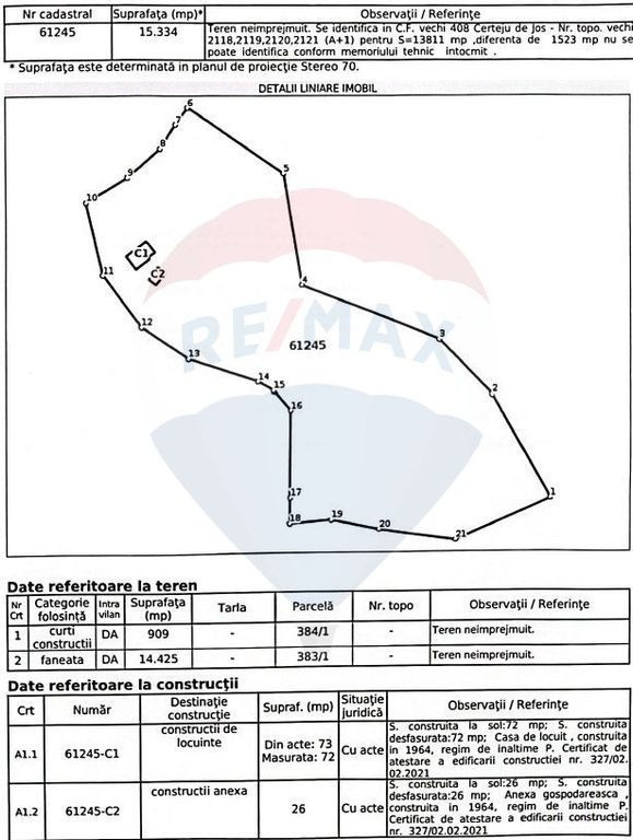 Într-un colț pitoresc al Munților Apuseni, în satul Certeju de Jos, comuna Vorta, județul Hunedoara, se află acest teren intravilan de 13.811 mp (în acte 15.334 mp), un loc cu un farmec aparte, unde natura și liniștea se împletesc perfect. Un cadru natural de poveste Aflat la doar 35 km de Deva și 20 de minute de autostrada A1 (ieșirea Ilia), terenul oferă acces facil, dar și o izolare binecuvântată de agitația urbană. Drumul asfaltat ajunge până la 50 de metri de proprietate, iar de acolo, doar câțiva pași te despart de acest peisaj superb. Locația este ideală pentru o casă de vacanță, o locuință permanentă sau un proiect turistic, fiind înconjurată de dealuri împădurite, aer curat și o atmosferă autentic rurală. Facilități și elemente unice: > Izvor natural pe proprietate – o resursă valoroasă, perfectă pentru consum sau irigații > Sursă de electricitate pe teren, inclusive trifazic, cu contor, facilitând orice proiect de construcție > Iaz cu pești, un detaliu rar întâlnit, ideal pentru relaxare și agrement > Construcție veche existentă, inscrisă in CF, ce poate fi renovată sau transformată într-un punct de plecare pentru un nou proiect > Acces rapid la drum asfaltat și autostradă, fără a pierde farmecul unei zone liniștite și izolate Terenul este potrivit > Pentru cei care caută liniște și natură, fie pentru o locuință permanentă, fie pentru o casă de vacanță > Pentru iubitorii de viață sănătoasă și sustenabilitate, cu acces la izvor propriu și un sol fertil pentru grădinărit > Pentru cei care vor să investească într-un proiect turistic, pensiuni sau cabane într-o zonă autentică > Pentru pasionații de pescuit și recreere, datorită iazului propriu și împrejurimilor naturale superbe Acest teren este mai mult decât o simplă proprietate – este o invitație la un stil de viață autentic, aproape de natură. Profită de această ocazie rară de a achiziționa un teren într-o zonă pitorescă, liniștită și cu potențial deosebit!