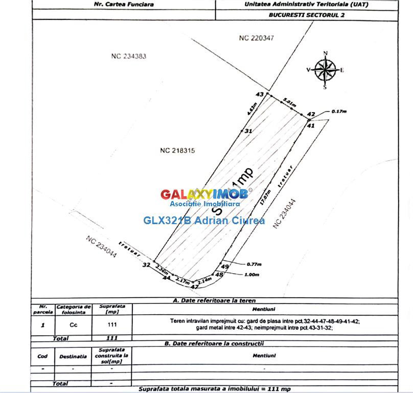 Oferta Exclusiva. Va propunem spre vanzare un teren intravilan zona Doamna Ghica, strada Heliade Intre Vii, are o suprafata de 312 mp, 201mp sunt in proprietate, iar pentru cei 111mp exista pe rol un proces de uzucapiune prin care proprietarul doreste sa dobandeasca terenul prin hotararea instantei, prin dreptul de uzucapiune. Vanzarea de drepturi litigioase se face evident prin contract. Terenul este imprejmuit si beneficiaza de toate utilitatile specifice zonei(curent, apa, gaz, canalizare, fibra optica). Accesul se face din 2 zone diferite. Terenul are o forma dreptunghiulara, cu dimesiuni de 15mlx20.8ml, cu deschidere la 2 strazi, acces auto, drum asfaltat. Cadastru, intabulare. Pretul de vanzare 200000 euro/mp. Conision 3%. Informatii eficienta energetica: