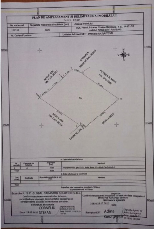 Vând 1036 mp -L 36 x l 30 m, Intrarea Nicolae Bălcescu, poziție panoramica cu toate utilitățile disponibile. Are deschidere la două străzi. Conform PUZ aprobat (Certificat de urbanism), regimul de inaltime pentru locuinte individuale este de S+P+1E, POT maxim=55%, CUT maxim=0,7 Pretul este 110 euro / mp. Accept schimb cu autoturisme.