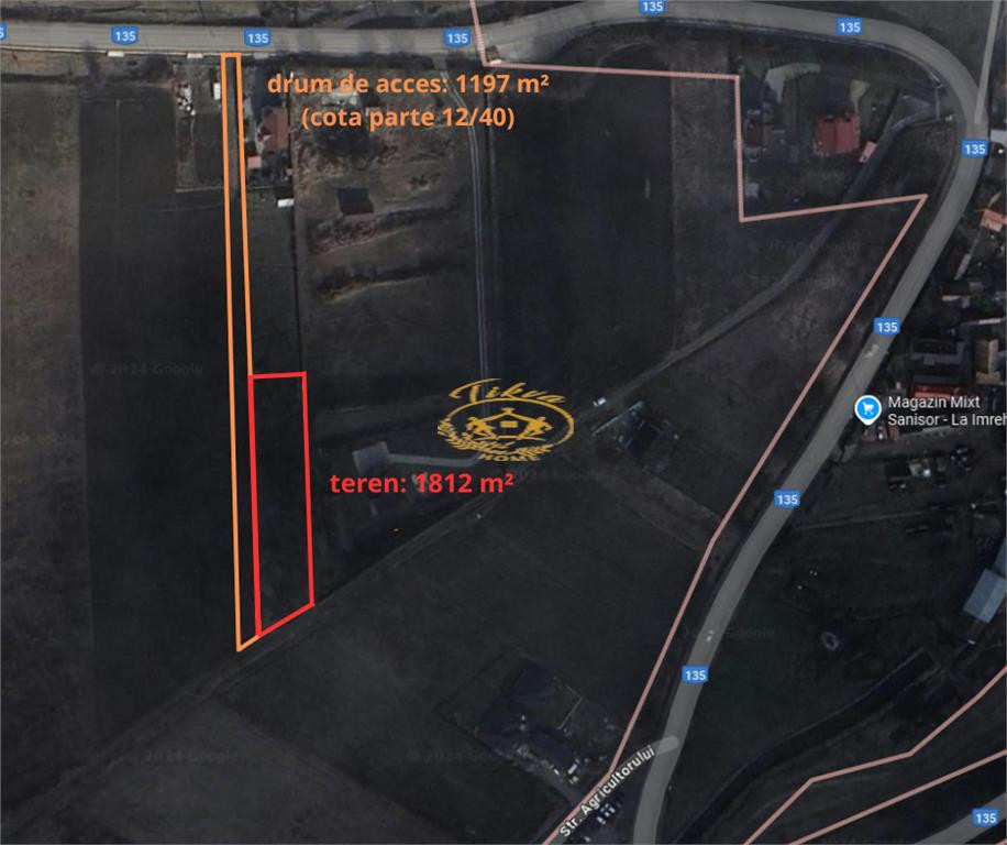 De vanzare teren intravilan pretabil pentru constructii in Sanisor (Com. Livezeni), jud. Mures, situat la intrarea in sat dinspre Targu Mures, la cca. 100 de metri de DJ135. Terenul are suprafata totala de 2171 msup2;, si se compune dintr-o parcela de 1812 msup2;, plus 359 msup2; (reprezentand cota parte de 12/40) din terenul vecin, care poate fi utilizat ca drum de acces. Terenul poate fi accesat si de pe un alt drum, care se deschide tot din DJ135. Are deschiderea de 98 metri la primul drum de acces si de 23 metri la celalalt drum de acces. Utilitatile (curent, apa, canalizare) sunt disponibile in apropierea terenului. Pret: 23 EUR/msup2; (in total: 49.900 EUR) - negociabil.