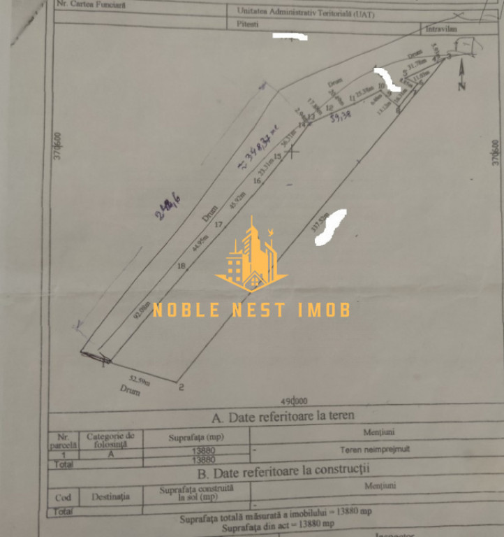 NOBLE NEST IMOB oferă spre vânzare un teren intravilan generos, cu potențial rezidențial sau investițional, situat în Pitești, pe strada I.C. Valentineanu, în zona de case din Prelungirea Craiovei – o zonă liniștită, aerisită, dar cu vizibilă dezvoltare urbană.. Terenul are o suprafață totală de 13.880 mp și se vinde parcelat, în funcție de nevoile cumpărătorului: ✅ Parcelele de 300 mp – 250 €/mp ✅ Parcelele de 500 mp – 225 €/mp ✅ Parcelele de 1000 mp – 200 €/mp Detalii teren: Suprafață totală: 13.880 mp (intravilan) Deschidere la stradă: 52 m Lungime: peste 300 m Ideal pentru lotizare sau construcție ansamblu rezidențial ✅ Avantaje: Acces facil din oraș și spre centură Zonă cu locuințe noi în dezvoltare continuă Poate fi parcelat în multiple loturi pentru construcții individuale Destinație ideală: Investiție în dezvoltare imobiliară (case, duplexuri) Proiecte tip ansamblu rezidențial Lotizare pentru vânzare ulterioară Contactează-ne pentru detalii, acte, plan parcelar sau vizionare la fața locului. NOBLE NEST IMOB – Partenerul tău pentru terenuri de viitor în Pitești! Id intern: P604