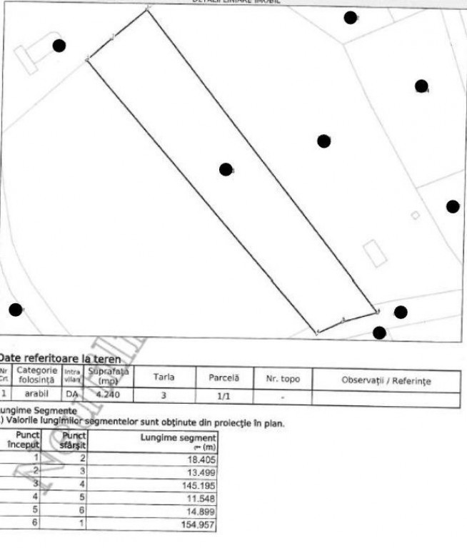Se vinde prin licitatie publica cota parte de 1/3 din dreptul de proprietate Teren intravilan arabil Suprafata teren 4.240 metri patrati Acces Neasfaltat Proprietatea are un front public de 26,43 metri la drumul de acces. Proprietatea beneficiaza de utilitatile zonei. Proprietatea nu este imprejmuita cu gard.