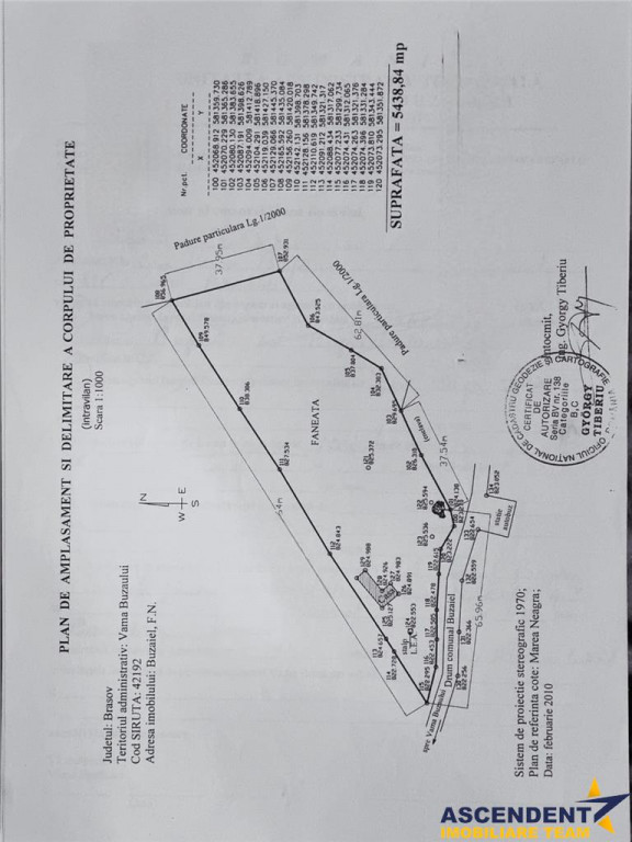 Comision cumparator: 0% ASCENDENT IMOBILIARE Va propune spre vanzare, in reprezentare imobiliara, un teren situat in satul Buzaiel, comuna Vama Buzaului, judetul Brasov, la aproximativ 60 km de centrul orasului Brasov. Va invitam sa experimentati o vizionare initiala, din locatia unde va aflati, chiar acum, prin accesarea filmului de prezentare: https://www.youtube.com/watch?v=UOPrkS5s61o Proprietatea este amplasata la poalele padurii, intr-un cadru natural spectaculos, cu dealuri line si peisaj deschis. Terenul beneficiaza de o pozitionare excelenta, avand acces direct din drumul judetean care traverseaza localitatea si ofera o panorama ampla asupra imprejurimilor. Suprafata totala este de 5.425 mp, distribuita astfel: 853 mp ndash; curti constructii 2.093 mp ndash; teren intravilan 2.478 mp ndash; teren extravilan Forma lotului permite o organizare eficienta a spatiului, fie pentru locuire, fie pentru dezvoltarea unui proiect turistic sau agricol. Pe unitate se afla o constructie din lemn, cu amprenta la sol de 67 mp, racordata la reteaua publica de energie electrica. Reteaua publica de apa se afla la limita proprietatii, ceea ce faciliteaza racordarea. Imprejmuirea existenta ofera delimitare clara si intimitate, iar deschiderea la drum asigura acces facil in orice anotimp. Pozitionarea la marginea padurii, linistea zonei si cadrul natural autentic transforma aceasta proprietate intr-o alegere ideala pentru: locuinta permanenta intr-un mediu sanatos si relaxant casa de vacanta cabana turistica sau pensiune proiect agroturistic sau retreat Este locul potrivit pentru cei care isi doresc un stil de viata echilibrat, aproape de natura, dar cu acces facil catre oras. Pentru informatii suplimentare sau programarea unei vizionari, va stam la dispozitie cu drag. Consilier specializat pe aleasa oferta: doamna Monica Naghi Telefon/ WhatsApp: 0760 851 889 Detalii, fotografii suplimentare si alte oferte similare exclusive: www.ascendentimobiliare.ro