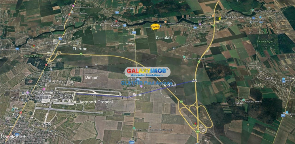 De vanzare teren intravilan in suprafata de 5000 mp cu acces de 20m direct la Drumul Judetean Balotesti Moara Vlasiei langa cartier de case noi construite cu utilitati la strada (curent,gaz,apa,canal),tot aici la strada trec toate mijloacele de transport spre Bucuresti. Prin PUG aprobat de primarie terenul are POT 30% si CUT 1% zona Mixta cu destinatii de: Servicii,Comert,Institutii Publice,Sedii firme,Posta,Telecomunicatii,Spatii sociale medicale,Locuinte cu (S/D P 1E M).De la teren se face un acces rapid la Nodul de Autostrada A3 Moara Vlasiei s au la Rondul de Urcare de la Aeroportul Otopeni zona Dimieni, in Nodul de Autostrada A0 . Pret 38 e/mp Tel 0722273199