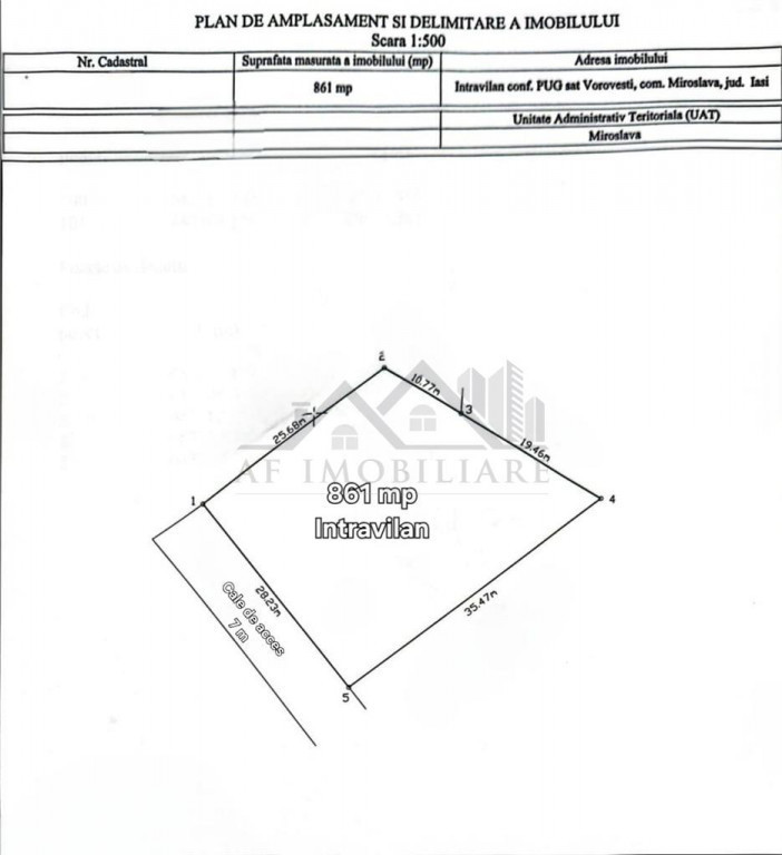 Teren de vanzare, intravilan in Vorovestindash;Miroslava Este situat intr-o zona linistita, cu priveliste deschisa si frumoasa catre padure. Teren cu forma buna, perfect drept si cu suprafata utila de 861 mp, la care se adauga 85 mp cale de acces, rezultand o suprafata totala de 946 mp. -Utilitati in zona; -Put adanc cu izvor puternic; -Terenul are autorizatie de constructie, sa inceput lucrarea, fundatia este facuta, casa pe plan parter(103.75= 85 mp 18.75 mp terasa) mansarda (80 mp=77.6 mp 2.33 mp); -Zona aerisita, ideala pentru locuinta. Pentru mai multe detalii si stabilirea unei vizionari sunati sau lasati mesaj.