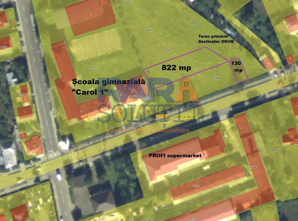 Se vinde suprafața de 952 mp de teren, cu lătime 15.5 metri. Str. Bogdan Dragoș, nr. 187A Municipiul Roman Terenul se învecinează cu Școala gimnazială "Carol I" și se află peste drum de supermarketul PROFI de pe strada Bogdan Dragoș. Suprafața este compusă din două loturi: Lot 1: 822 mp, lătime 15.5 metri, lungime 26 de metri Lot 2: 130 mp, lătime 8 metri la strada Bogdan Dragoș, lungime 16.7 metri Lotul de lângă stradă poate servi drept parcare și spațiun pentru căminele de branșamente la utilități. Cumpărătorul NU plătește comision!