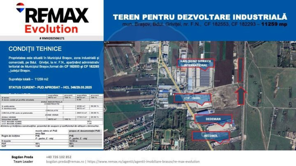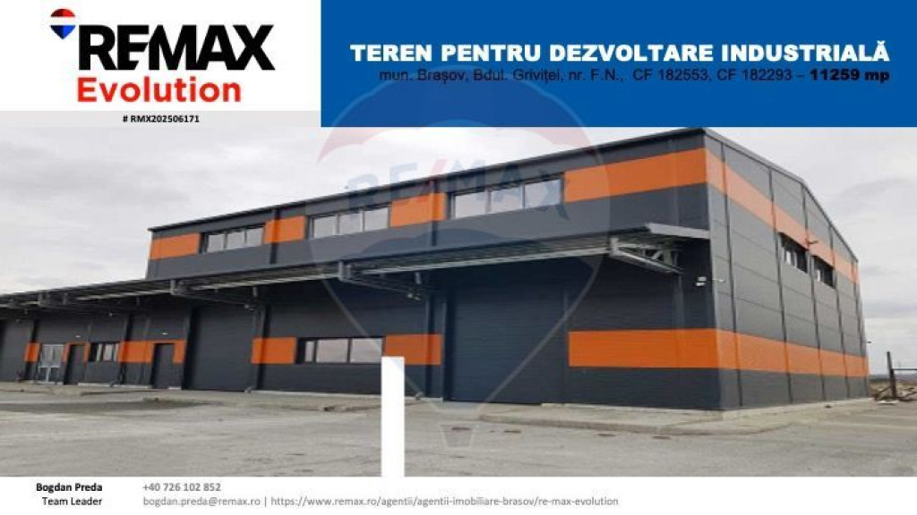 Preț vânzare: 1.000.000 € Modalități de plată: achiziție în tranșe (maximum 18 luni de la obținerea AC) Localizare și Avantaje Zonă - Poziționat strategic pe Bdul. Griviței, municipiul Brașov (CF 182553 și CF 182293). - Acces facil la principalele artere ale orașului și conectivitate rapidă cu Ocolitoarea Brașov (2 km). - Distanțe cheie: -Coresi Resort: 5–7 km - AFI Mall: 5–7 km - Centrul Brașovului: 5–7 km - VGP Brașov: 6–10 km - Aeroport Ghimbav: 8–10 km -În proximitate: Dedeman, CTP – Dhiel, Karl Heinz Dietrich International, Recobol, ceea ce asigură un ecosistem activ pentru logistică, comerț și industrie. Date Tehnice - Suprafață totală teren: 11.259 mp - Status juridic: intravilan, PUD aprobat (HCL 346/29.05.2025) - Funcțiune aprobată: dezvoltare industrială/comercială - Coeficienți urbanistici conform PUD aprobat – oportuni pentru proiecte industriale, logistice sau mixte. Oportunitate Investițională Acest teren reprezintă un punct de ancoră pentru dezvoltări industriale sau comerciale în una dintre cele mai dinamice zone ale Brașovului. Poziționarea lângă jucători mari din domeniu, accesul facil la infrastructură și aprobările urbanistice deja obținute fac din acest teren o investiție cu randament ridicat și risc redus. Structura de plată flexibilă – cu tranșe de maximum 18 luni de la obținerea autorizației de construire – oferă investitorului predictibilitate financiară și libertate de planificare a cash-flow-ului.