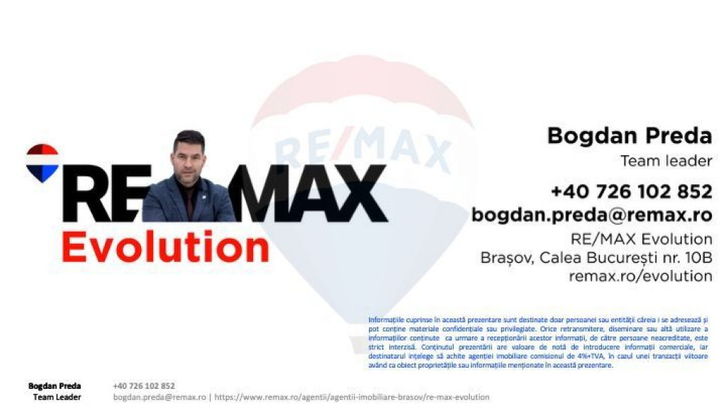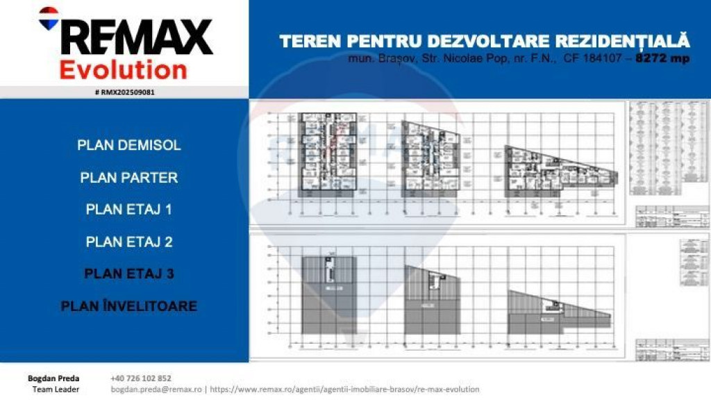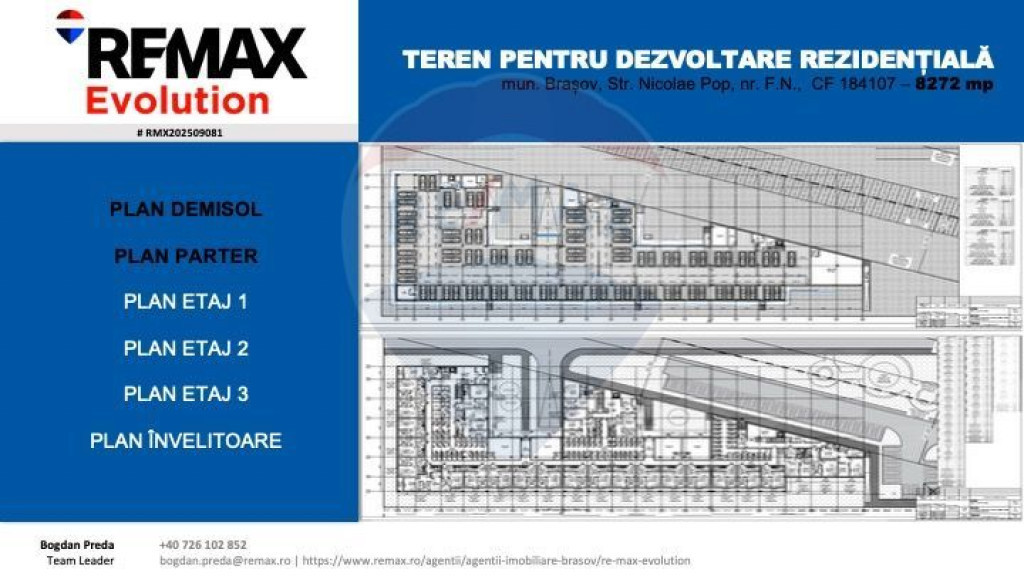 Teren rezidențial de vânzare – Brașov, Str. Nicolae Pop, 8.272 mp Structură de plată: tranșe pe max. 18 luni / cash + unități finale AC 492/28.10.2025 Specificații -Suprafață teren: 8.272 mp (CF 184107, intravilan) - PUD aprobat (HCL 17/31.01.2024) - Funcțiune: locuințe colective + spații comerciale (Scările A, B, C) - Regim înălțime: D+P+3E, Hmax = 20 m - Suprafață desfășurată autorizată: 13.499 mp - Suprafață construită: 3.128 mp Localizare - 5-7 km: Coresi Resort, AFI Mall, Centrul Brașovului - 8-10 km: Aeroportul Ghimbav - 2 km: Ocolitoarea Brașov - Vecinătate: Kaufland, Lidl, Leroy Merlin, Paradisul Acvatic, Stadionul Tineretului Oportunitate - Teren cu documentație urbanistică aprobată, pregătit pentru dezvoltare. - Autorizație de construire 492/28.10.2025