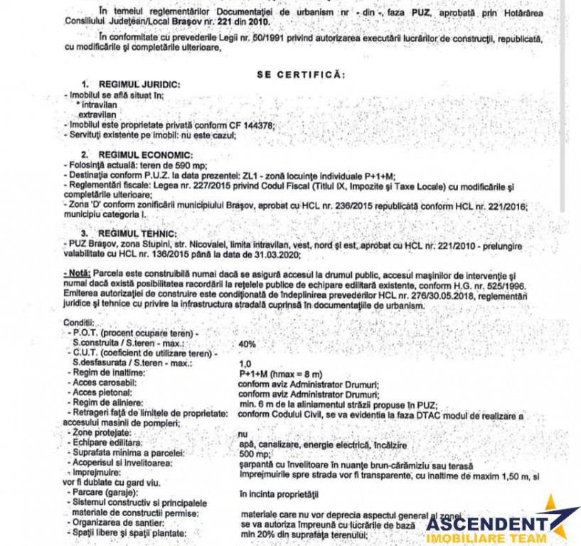 Comision cumparator: 2% TVA din valoarea de tranzactionare. ASCENDENT IMOBILIARE va propune spre vanzare un teren intravilan, recomandat constructii casa/vila, rezidenta de vacanta si similare, situat in Stupini, Brasov. Teren eset intravilan cu PUZ reglementat, avand o suprafata de 590 mp si deschiderea de 22 ml. Caracteristicile teren: POT 40 % CUT 1,0 Regim de inaltime S P 1 M Utilitati in imedata apropiere (gaz, curent, apa, canalizare). Zona in plina dezvoltare, cu case in imedata apropiere a terenului. Pe lot se afla o constructie din lemn, ideala pentru depozitare sau chiar locuit. Pentru cunoasterea in detaliu a proprietatii va asteptam la vizionare! Consilier dedicat alesei oferte: doamna Stramciuc Florentina Telefon/ WhatsApp: 0761730575 Detalii suplimentare, fotografii, precum si alte variante similare exclusive: www.ascendentimobiliare.ro