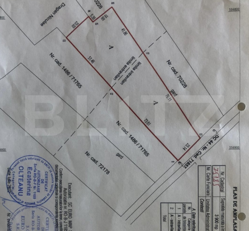 BLITZ oferă spre vânzare un teren generos situat în localitatea Mereni, ideal pentru dezvoltare rezidențială sau investiție, cu o suprafață totală de 3.900 mp, la care se adaugă aproximativ 4.100 mp în plus față de suprafața din acte. Terenul este împărțit astfel: 2.125 mp intravilan – arabil 1.775 mp extravilan – arabil Caracteristici principale: Deschidere de aproximativ 23,14 ml la drum de acces Acces facil din drum Utilități disponibile la limita proprietății (apă și curent) Formă alungită, potrivită pentru parcelare sau proiect rezidențial Teren delimitat și identificat cadastral Avantaje zonă: Amplasat într-o zonă liniștită Vecinătăți cu locuințe noi în dezvoltare Potențial excelent pentru construcție casă sau investiție pe termen mediu/lung Suprafața mixtă oferă flexibilitate: zona intravilană pentru construcție, iar cea extravilană poate fi utilizată pentru grădină, livadă sau alte activități. Cod ofertă / ID BLITZ: P167315 Id intern: P167315