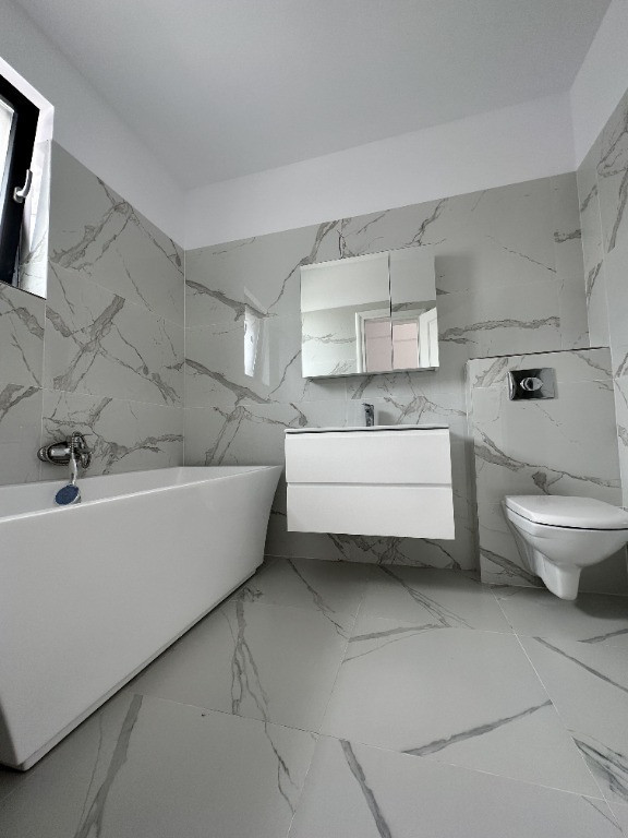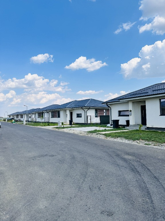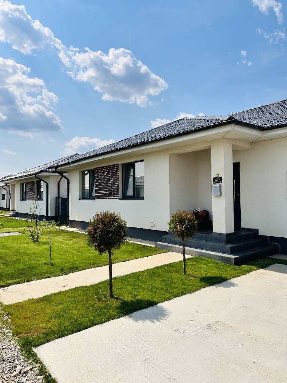 Casă beneficiază de curte individuală cu suprafața 510 mp, în care este inclusă amprenta casei (135 mpc), cu un gard împrejmuitor, din plasă bordurată, de 150 cmh.
