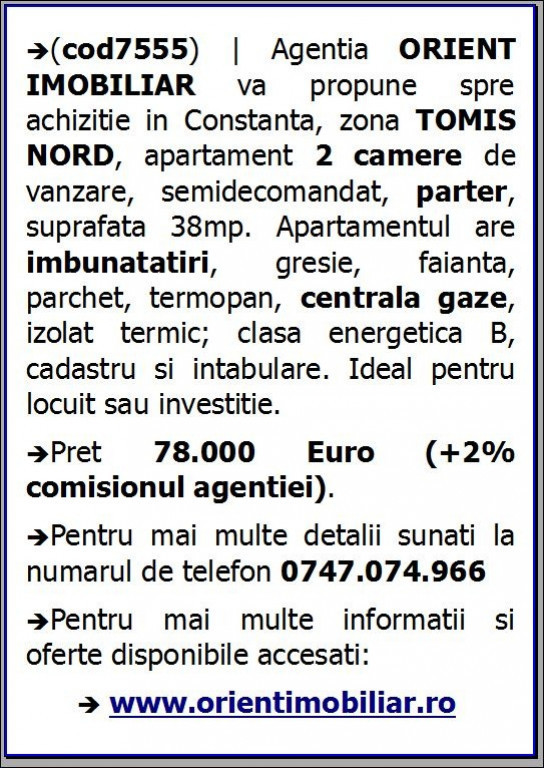 (cod7555) | Agentia ORIENT IMOBILIAR va propune spre achizitie in Constanta, zona TOMIS NORD, apartament 2 camere de vanzare, semidecomandat, parter, suprafata 38mp. Apartamentul are imbunatatiri, gresie, faianta, parchet, termopan, centrala gaze, izolat termic, clasa energetica B, cadastru si intabulare. Ideal pentru locuit sau investitie pentru inchirieri de sezon sau termen lung. Pret 78.000 Euro (+2% comisionul agentiei). Pentru mai multe detalii sunati la numarul de telefon 0747.074.966.