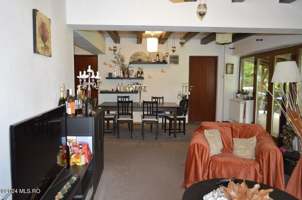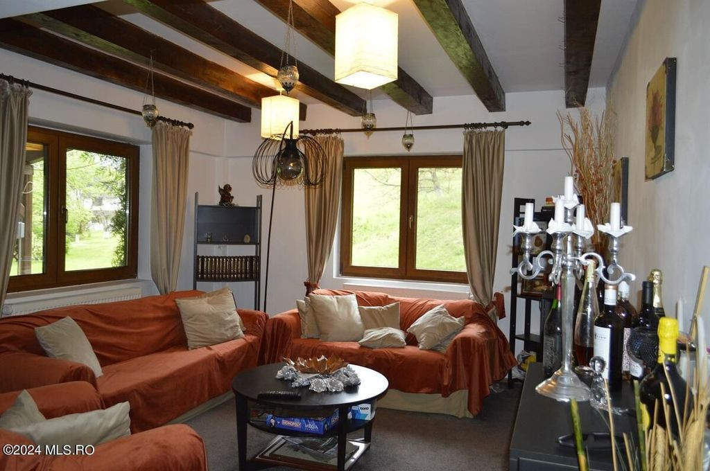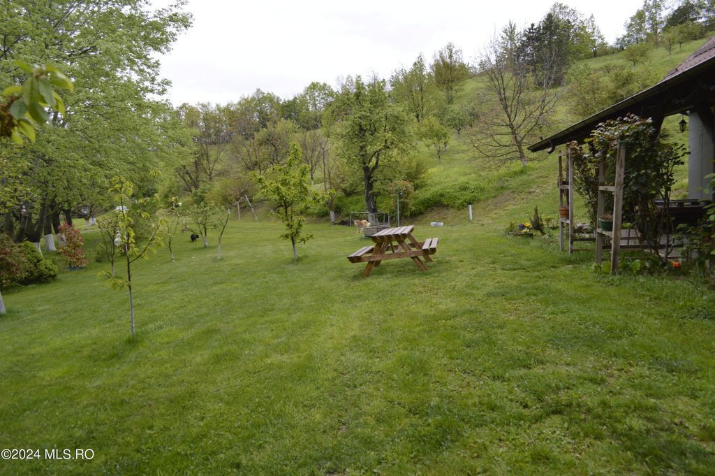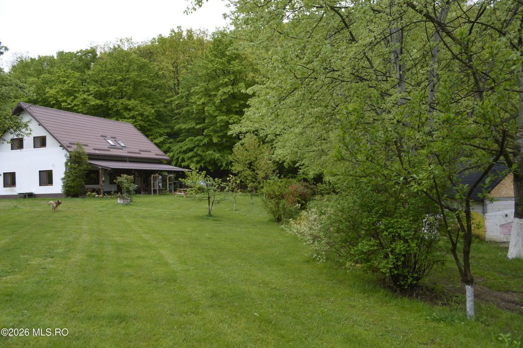 TOPOLOVENI - CASA CU TEREN 1500 MP LANGA PADURE, GARAJ, ANEXE. Zona de prestigiu, exclusivista. Casa intr-un peisaj mirific, lot impadurit, alee cu acces individual, gazon cu plante decorative si pomi fructiferi, terasa amenajata. Interior impresionant, 5 dormitoare cu 5 bai, birou, bucatarie, camera de zi, centrala pe lemn, magazie, garaj.
