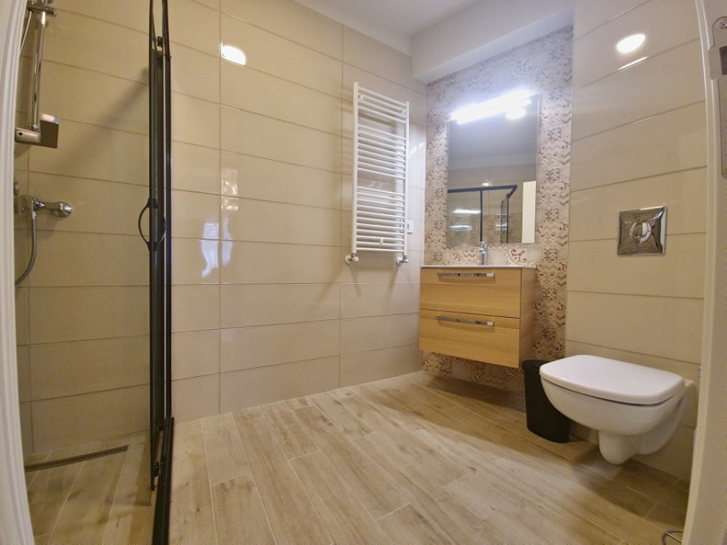 Apartamentul dispune de două băi moderne cu dus, dotate cu toate facilitățile necesare, pentru a-ți asigura un confort optim în rutina zilnică.