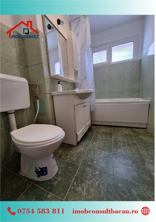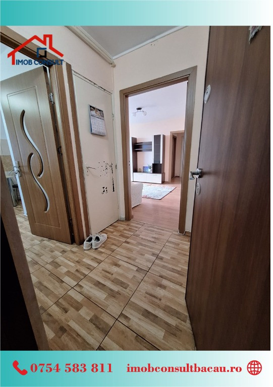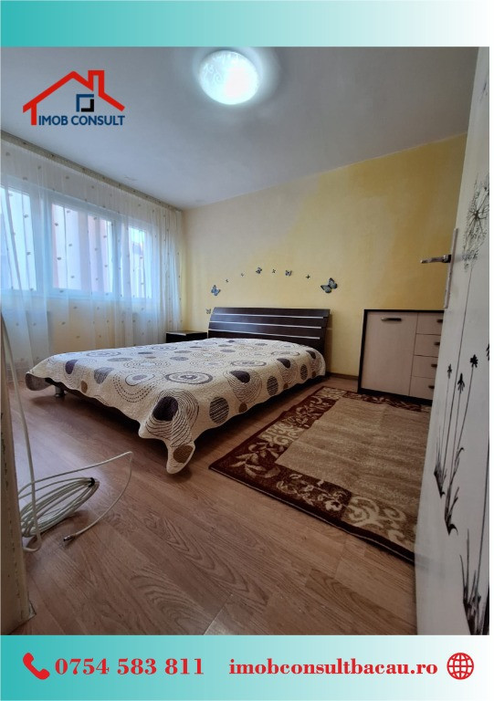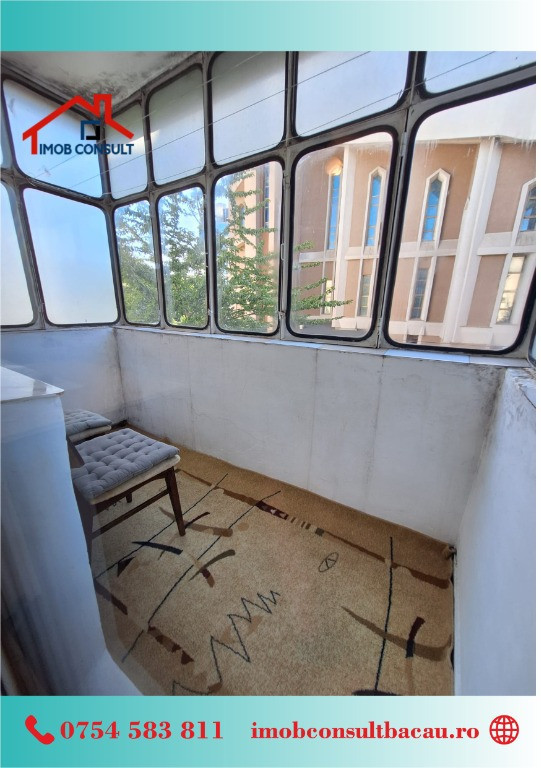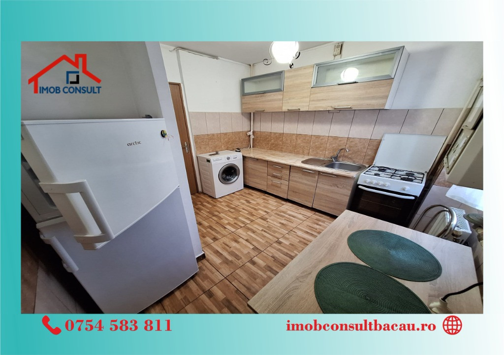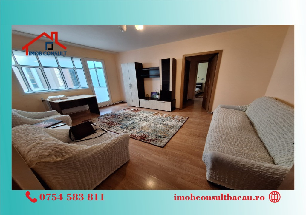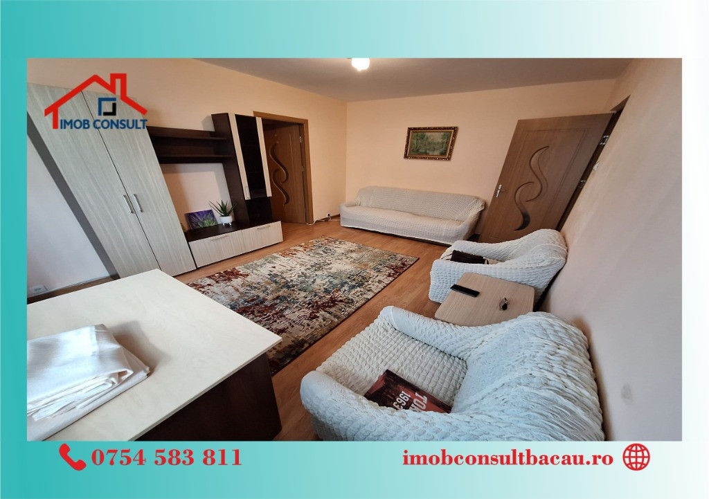 Echipa Imob Consult Bacau, va prezinta spre inchiriere un apartament cu doua camere situat la etajul 2 al unui imobil cu 4 etaje. Locație excelentă, chiar in centrul Bacaului. Ideal pentru un stil de viață relaxat și accesibil. Detalii esentiale: - Suprafata utila de 45 mp; - Dotări: geamuri termopan, balcon; - Baie: complet echipata. - Confort: centrală termică proprie. - Complet echipat si utilat. Puncte de interes în zonă: - Parcul Cancicov și Teatrul de Vară. - Restaurante, școală, farmacii și alte facilități utile. Pentru vizionari si relatii suplimentare, contacteaza-ne: - Cosmin: 0754 583 811; - Corina: 0740 288 297, sau la sediul agenției noastre, Imob Consult Bacau, situat pe strada Banca Națională nr. 27 la intersecția cu Str. Neagoe Vodă, langa Irish Pub.