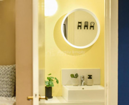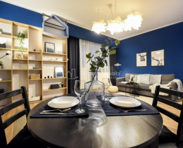 Spatiul principal, de 26,04 mp, este generos si delimitat functional intre zona de dormit, amplasata intr-o nisa tip alcov, si zona de living, amenajata cu canapea, masuta si mobilier de depozitare. Bucataria este separata, compacta si utilata cu mobilier modern, plita si chiuveta, iar baia este complet echipata. Exista si un WC separat, ceea ce reprezinta un avantaj important pentru acest tip de locuinta.