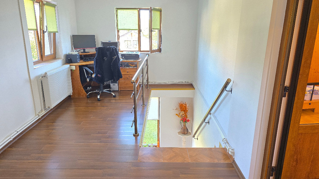 Vand casa in Deva, zona Zavoi, P+E, constructie din BCA si boltari, izolata exterior, renovata integral si contructie etaj in anul 2011 (primul nivel a fost construit in anul 1989), acoperita cu pod si tigla ceramica, suprafata construita 262 mp, amprenta la sol de 147 mp. suprafata totala de teren 1054 mp, deschidere la strada de 22 metri liniari, acces auto in curte, amenajata modern, incalzire cu centrala termica pe lemne cu pufar si boiler pt. apa calda de la centrala si electric, semineu, tamplarie PVC cu geam termopan normal si tripan, usi interioare din PVC, gresie, faianta, parchet. La parter este compusa din: living, bucatarie, dormitor, baie, camera tehnica, camara, dresing, 2 terase si garaj deschis pentru 2 masini. La etaj din: 3 dormitoare, birou, baie si hol. Curtea este ingradita, partial pavată, dispune de magazie de lemne, padoc pentru caine si gazon. Proprietatea se vinde partial mobilată. Utilitati: apa, canalizare, curent, internet trase in casa si gazul la poarta. Pret: 235 000 euro neg. Tel: 0724 293226. Mai multe poze VIDEO si detalii pe www.apartamentedeva.ro sau la Agentia imobiliara Ovidiu Deva.