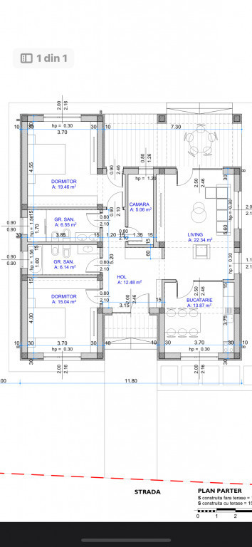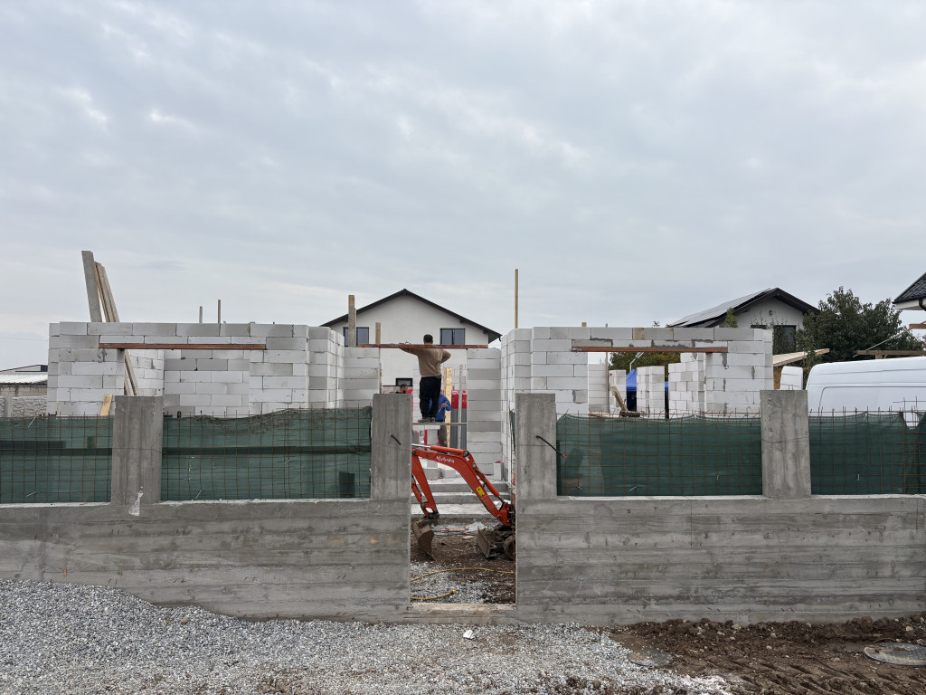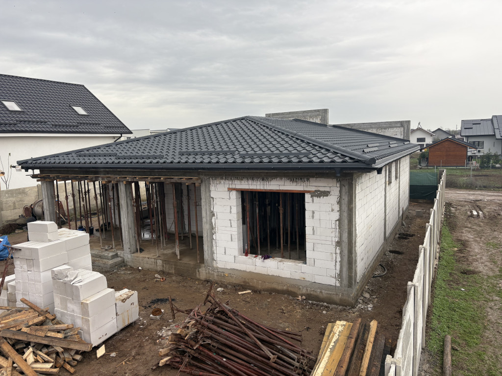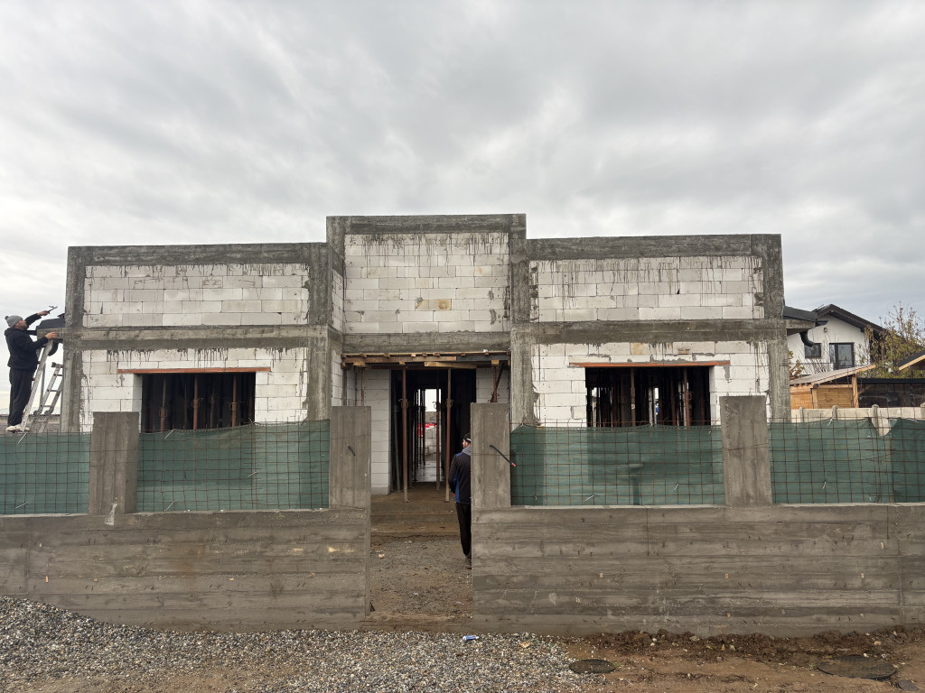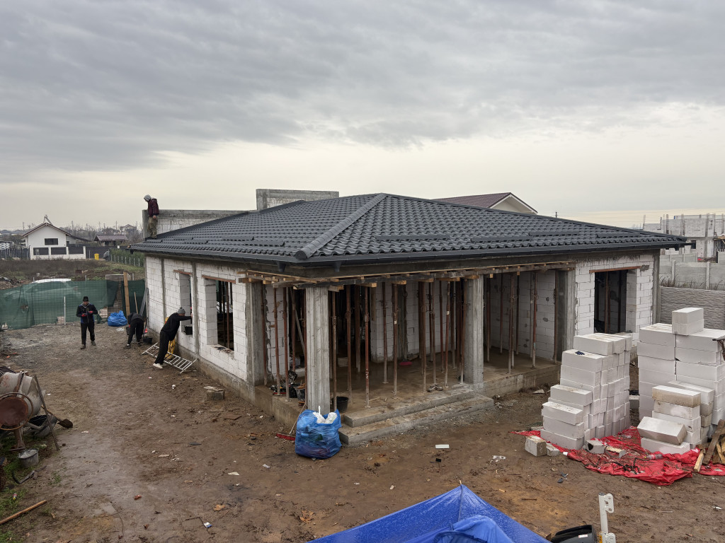 Vând casă la roșu,pe parter,în comuna Cârcea,situată în cartier nou,la 5 min de Craiova și de aeroport Ca și utilități are trase curent,gaz,apă,canalizare. Bca îl folosit pt construcție este de 30cm,,planșeu superior placa beton armat. Acoperișul este țiglă metalică bilka,tip romanik Casa este compusă din 2 dormitoare,sufragerie,bucătărie ,2 băi ,cămară,hol și terasă. Suprafața utilă este de 101m2 plus terasa de 20m2 Suprafața terenului este de 500m2 Dispun de video și poze de la săpături până la acoperiș cu toate detaliile construcției.