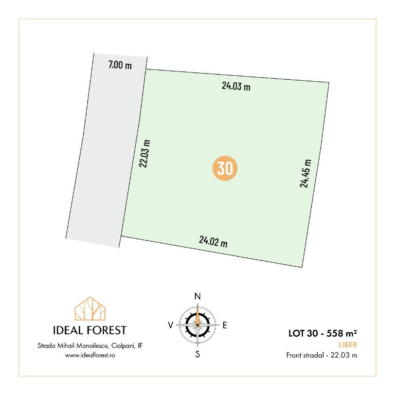 Vă oferim o oportunitate unică de investiție pe un teren situat în Izvorani,cu deschidere la padurea Snagov. Suprafață totala a terenului este de de 21774mp. Loturile au suprafete cuprinse intre 407si 730 mp, avand destinatia de teren curti constructii. Oferim spre vanzare lot 30 in suprafata de 558mp, front stradal 22,03m. Pretul afisat este promotional si include canalizare si apa, lucrari efectuate la fiecare parcela doar in incinta complexului, pana la poarta si drumul la nivel de piatra concasata. Acest teren are un potențial extraordinar, oferind posibilitatea unor constructii intr-o zona linistita,in continua dezvoltare, in jur aflandu-se la momentul actual si alte proprietati. Toate utilitatile la strada principala (curent,gaze, canalizare ) făcând din acesta o alegere excelentă pentru viitoarea dvs. locuință Cu o locație excelentă , este pregătit pentru a deveni baza unei investiții de succes. Pentru vizionari, oferte si alte detalii, puteti accesa site-ul .idealforest.ro sau telefonic.