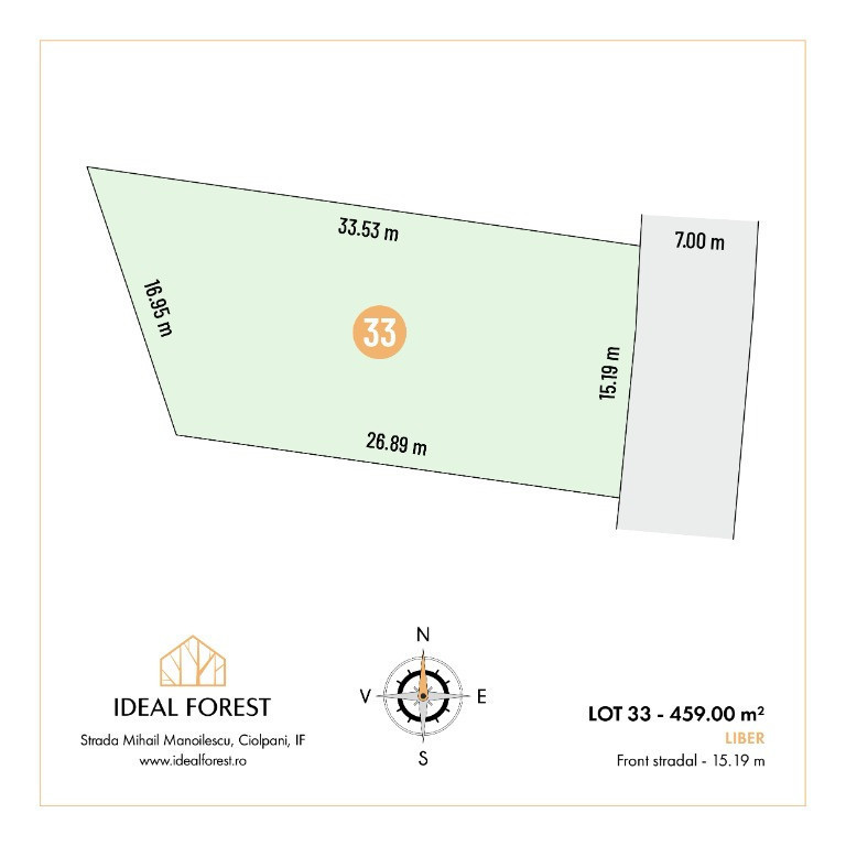 Situată la o scurtă distanță de București, comuna Ciolpani este atractivă pentru cei care doresc să se bucure de liniște și natură, fără a renunța la facilitățile oferite de un oraș mare. Pădurea Snagov oferă oportunități excelente pentru activități în aer liber, cum ar fi plimbări, drumeții sau ciclism. De asemenea, lacul Snagov este cunoscut pentru frumusețea și posibilitățile variate de agrement pe care le oferă. Oferim spre vanzare lot 33 in suprafata de 459mp, front stradal 15,19m. Pretul afisat este promotional si include canalizare si apa, lucrari efectuate la fiecare parcela doar in incinta complexului, pana la poarta si drumul la nivel de piatra concasata. Toate utilitatile la strada principala (curent,gaze, canalizare ) făcând din acesta o alegere excelentă pentru viitoarea dvs. locuință Cu o locație excelentă , este pregătit pentru a deveni baza unei investiții de succes. Pentru vizionari, oferte si alte detalii, puteti accesa site-ul .idealforest.ro sau telefonic.