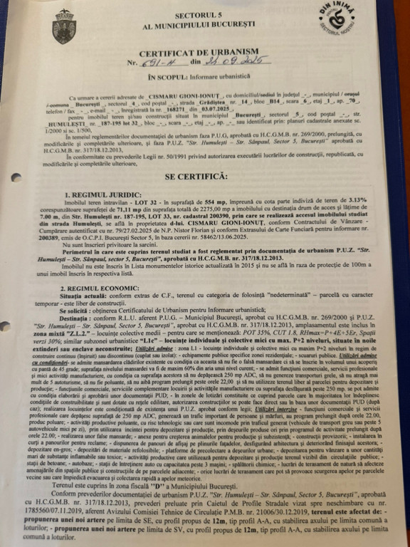 Proprietar, vând teren intravilan 600 mp, D - 21 m, zonă de vile, gaze, curent, canalizare la 100 m, toate actele la zii, zona sectorul 5 , certificat de urbanism P + 2 ,Telefon 0785215652