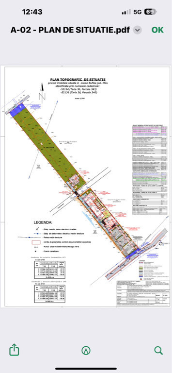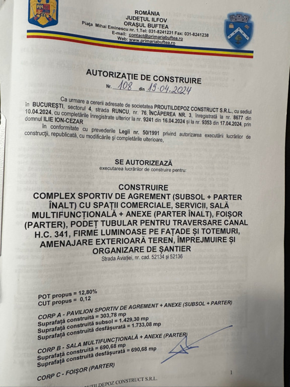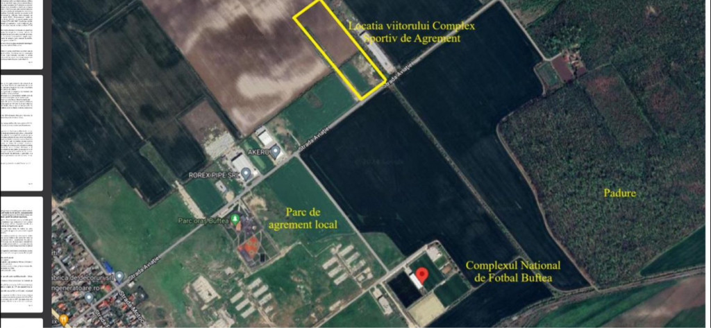 Ofer spre vânzare teren intravilan , în suprafață de 9.000 mp , dezmembrat în 2 loturi ! Este situat pe Str Aviatiei vis-a-vis de Centrul Național de Fotbal . Beneficiază de toate utilitățile , iluminat stradal , apă , canalizare , gaz ! Curentul electric trifazat , este plătit și instalat ! La ambele capete limite ale terenului sunt străzi , una din ele asfaltată (Aviației) și-n în curs de transformare în 4 benzi . La aprox 500 m este autostradă 0 , iar new centură a orașului Buftea este la aprox 200 m . Deasemenea pădurea Buciumeanca este în proximitate ! ( 200 ) În prețul terenului , este inclus un proiect imobiliar , compus din subsol , parter înalt (6 m) , Spații Comerciale Salon Evenimente Hală , Foișor Barbeque , Parcare Auto ! Menționez ca acest proiect este autorizat și beneficiază de Urbanism , Autorizație de Construcție , iar toate avizele și taxele sunt plătite la zi ! Într-o eventualitate , lucrările pot fi inițiate în orice moment !