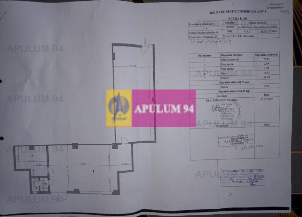 Compania imobiliara Apulum94 va ofera spre vanzare un spatiu comercial in suprafață totală de 163 mp, avand amplasare ultracentrala in municipiul Alexandria, pe strada Libertatii, vizavi de Parcul Central. Include atât spațiul "Sud Megashop" cât și biroul de asigurări. Mentionam ca exista echipare pt curent trifazic la locatie, exista grup sanitar, 2 cai acces. Unul din avantajele principale ale acestei locatii este traficul pietonal intens. Pretul (negociabil ) solicitat de proprietar este de 200.000 EUR Foarte important!!! Daca exista real interes pentru achizitie, proprietarul ia in calcul si identificarea unei solutii de plata in rate, aspect ce se va discuta ulterior, dupa semnarea documentelor de baza. Noi credem ca această proprietate reprezintă o oportunitate comercială pentru cei care caută să investească într-o locație premium în inima Municipiului Alexandria. CONTACT: 0733.683.456 / [email protected]