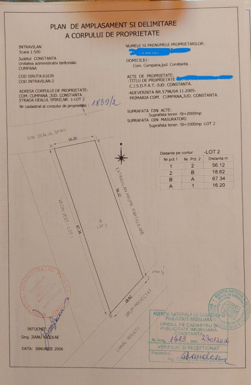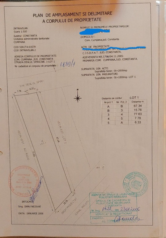 Ofer spre vanzare 2 terenuri intravilane de cate 1000mp, care se vand individual, obtinute prin dezmembrare cadastrala, a unui lot de 2000 mp, Terenul e situat in com. Cumpana si este ideal pentru investitii de orice fel, utilitatile sunt la limita proprietatii. Toate actele sunt la zi. Descrierea loturilor le aveti in imaginile postate. Pret 30euro/mp , TF :0722807122