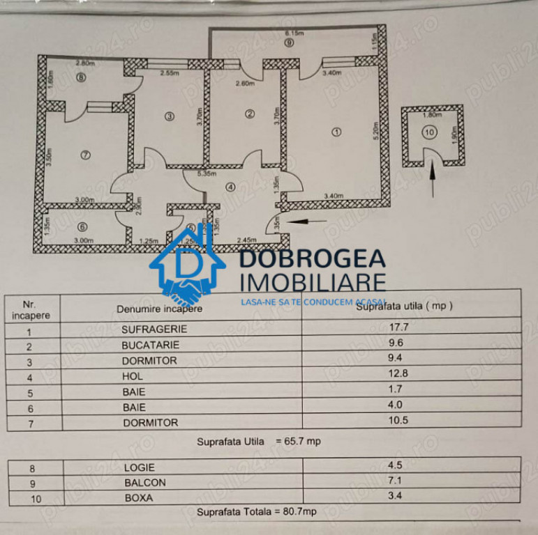 Dobrogea Imobiliare va prezinta spre vanzare un apartament cu 3 camere, decomandat situat in zona CENTRALA,etaj 4 Compus din living,2 dormitoare ,bucatarie, 2 bai, balcon, loja cu o suprafata utila totala de 65.7 mp. Impreuna cu apartamentul se ofera si boxa de 3.4 mp. Blocul este construit in 2001. Apartamentul beneficiaza de centrala termica proprie, aparat de aer conditionat si un balcon mare de 7.1 mp. Se vinde partial MOBILAT si partial UTILAT Va așteptam la vizionare! Ne puteți vizita la sediul nostru situat pe str. Pacii, nr. 6 (la parterul hotelului Select) pentru consultanta gratuita Pentru mai multe oferte vizitați site-ul www.Dobrogea-Imobiliare.ro sau pagina https://www.facebook.com/agentia.dobrogea.9 Id intern: P1961
