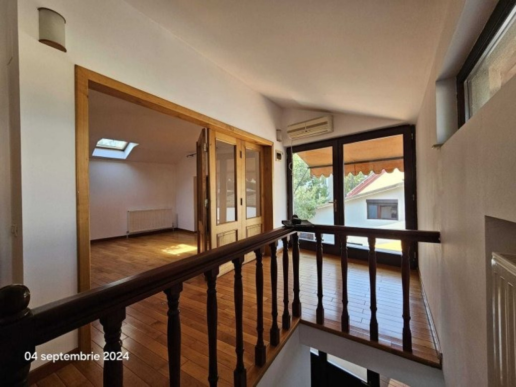 Vila se compune din S+P+1. Suprafata desfasurata 306 mp Suprafata teren 220 mp, Curte libera 50 mp plus doua garaje. Parterul imobilului de compune din living, dressing, bucatarie, 2 camere si baie suprafata totala 172 mp Etaj: 4 camere,2 bai, terasa si pod, suprafata totala 120 mp Subsol: pivnita Imobilul a fost renovat integral in anul 2022 si se prezinta in conditii foarte bune. Se preteaza atat pentru rezidenta cat si pentru activitate de birou sau scoala privata. Imobilul nu este mobilat dar exista disponibilitate in acest sens in functie de destinatia viitoare