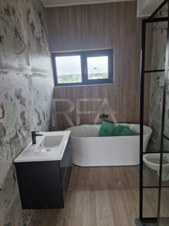 R.E.A. Imobiliare Minicomplex securizat cu 5 case, toate utilitățile incluse (gaze, curent, apă/canalizare) și asfalt rutier în interior. Structură solidă și construcție de calitate: cadre beton, cărămidă Porotherm Soceram de 30 cm, pereți exteriori 45 cm, plăci beton izolate, pod neamenajat. Fațade cu termosistem 10 cm EPS 80 și finisaj decorativ Caparol. Ferestre Veka Softline 82MD cu geam tripan Low-E 4 clima guard solar, culoare gri antracit, glafuri aluminiu. Acoperiș Wetterbest gri antracit mat. Compartimentare: • Parter: living + bucătărie + dining + baie + cameră tehnică • Etaj: 2 dormitoare + baie cu duș, dormitor matrimonial + baie cu cadă + dressing • Terasă 20 mp cu pergolă retractabilă electric Finisaje și dotări premium: Delta Studio – ceramică, parchet, obiecte sanitare Roca; baterii Kludi; aparataj Gewiss; uși celulare Germania. Tavanele și pardoseala izolate cu polistiren extrudat, pod izolat cu vată bazaltică și folie aluminiu. Confort și tehnologie: încălzire în pardoseală cu sistem automatizat și centrală Immergas cu asistență 24/7, pregătire pentru panouri fotovoltaice și pompe de căldură, A/C living și dormitor matrimonial. Smart home cu senzori apă/gaz și control temperatură de la distanță, 6 luni mentenanță gratuită + training. Curte și exterior: 2 locuri de parcare, gazon cu sistem de irigații automat, placă beton 3×2 m pentru magazie, acces securizat prin poartă electrică. Vecinătățile: aproape de DN1 (aprox. 5 minute), Therme București (aprox. 10 minute), centre comerciale, restaurante, școli și grădinițe, dar și de zone verzi și lacuri pentru relaxare.Drumul principal este asfaltat cu Beton Rutier B400. Informatiile tehnice au caracter orientativ, acestea fiind preluate de la proprietar. Acces la transportul în comun->10 minut pana la statiile STB . Pentru detalii si vizionari, va rugam sa ne contactați, specificand codul de identificare P8557. Id intern: P8557