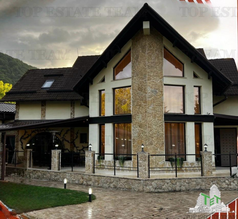 Excelenta prin experienta ! Vanzare vila zona Bran. Vila este situata in apropierea castelului Bran, pe o strada ferita de zgomotsi poluare. Proprietatea este super amenajata si compartimentarea este urmatoarea : La parter gasim un living in zona dinning, baie, hol acces si dormitor, sala cinema , piscina, sala gimnastica, sauna uscata si sauna umeda. Langa piscina in afara casei este o terasa amenajata si exista un rau care traverseaza acest lateral. La demisol este amenajata o crama , o sala de jocuri, o centrala separata pentru acest demisol. La etaj sunt 4 camere cu baia sa fiecare, iar una dintre ele este special amenajata pt 3-4 copii.In curte gasim un garaj pt 4-5 masini, un foisor. In curte exista un foisor cu o camera si baie. Vila este dotata cu toate utilitatile necesare: curent, apa, gaz, centrale termice, calorifere, aparate aer conditionat, internet- wireless. Accesul se realizeaza rapid din DN.
