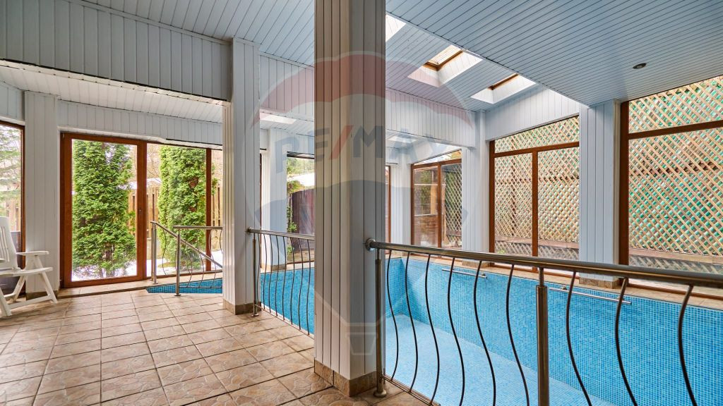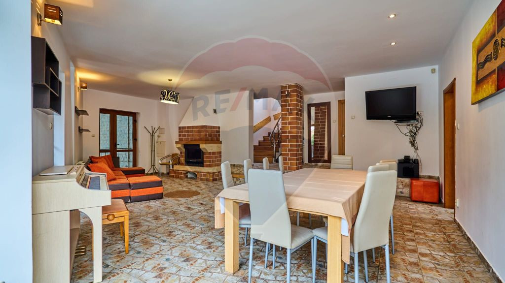 Parter: living generos cu loc de servit masa pentru 10 persoane, semineu cu lemne si piscina interioara cu iesire pe terasa si spre foisorul de vara; un dormitor cu fereastra rotunda , luminoasa, bucatarie complet dotata si utilata, baie cu dus si loc de depozitare haine/ lenjerii.