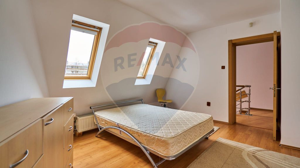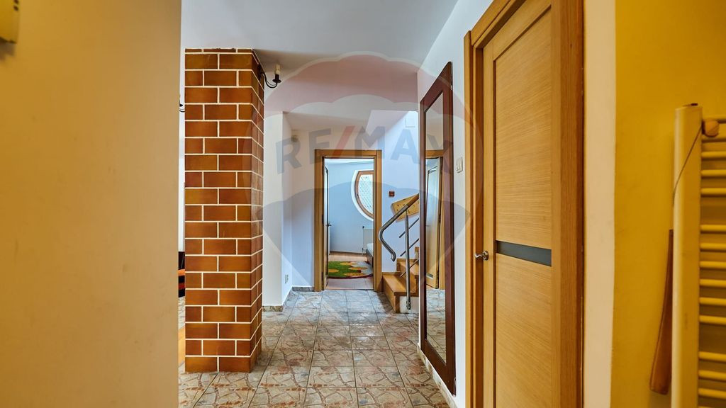 Accesul dintre etaje se face pe o scara interioara din lemn, luminata cu ferestre mari cu vedere in curte.