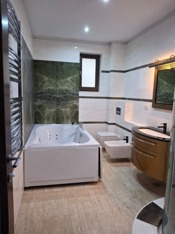 Aceasta resedinta exclusivista imbina eleganta clasica,atentia pentru detalii si comfortul contemporan. Amplasata pe un teren generos de 764 m,dispusa pe 2 nivele (P+1+M locuibila, open space transformat in gym, cu sauna si baie proprie) a fost construita pentru uz personal si se remarca printr-o arhitectura moderna si finisaje de top,eleganta impletindu-se armonios cu tehnologia. Ca elemente de originalitate sunt balconul executat la comanda de SuperFaber cu aprobarea arhitectului Pais care detine brevetul omologat la OSIM (in afara de vila mea, mai exista doar una singura in Romania cu acea balustrada), iar in living - o lastra de onix masiv (500 kg) pe suport metalic executat de SuperFaber. Finisaje de lux: - holuri,living,bucatarie,casa scarii placate cu granit brazilian Shiwakashi Gold -parchet in dormitoare - camerele tehnice (centrala,depozit,spalatorie,terasa exterioara) placate cu granit Padang Peach - toate cele 4 bai sunt in granit brazilian Verde/Bamboo si travertin alb din Pamukale - bucatarie cu blat din cuart de 3 cm.grosime si aparatura electrocasnica Bosh premium, frigider Liebherr, masina de spalat si uscator Miele - instalatii sanitare de top - 2 jacuzzi - o sauna de 9 kw marca Harvia - centrala termica de 55 KW marca Viesmann si chiller York - video-interfon Electra pe fiecare nivel - la exterior,trotuarele sunt din beton placat cu granit, degivrate electric -terasa exterioara, burlanele si jgheaburile degivrate electric - panou solar Rottner, Germania -acoperis din tigla metalica acoperita cu ardezie, marca Gerard, garantat 50 ani -caramida originala Klinker, Germania Curtea este pavata cu pavaj Klinker de 10 cm rezistent la trafic intens si tonaj mare ( max.5 tone). In curte, in spatele casei, mai exista o constructie folosita pe post de magazie/depozit unelte. Incalzirea se face cu centrala termica in condensatie marca Viesmann dotata cu boiler de 300 litri si instalatie de incalzire prin pardoseala, alternativ prin chiller York si instalatie cu ventiloconvectoare care asigura si racirea locuintei. Casa este termoizolata cu pachetul carbon de la Caparol (polistiren cu carbon de 10 cm, plasa de carbon si vopsea decorativa Caparol), peste care este aplicata caramida termoceramica de 1,5 cm de la Klinker, Germania.Termopanele sunt din PVC cu 5 camere de la Veka Alphaline 90. La mansarda, izolatia este facuta prin spuma poliuretanica aplicata in strat de 10 cm imediat sub astereala, peste care s-a pus vata minerala de 10 cm si apoi s-a placat cu panouri de rigips verde, rezistent la umiditate. Constructia are clasa energetica A. Compartimentarea este inteligenta, camerele sunt mari, spatioase, multiple spatii de depozitare. Parter: dressing, birou,baie,living f.spatios, bucatarie cu spatiu depozitare, spalatorie, depozit alimente ,camera tehnica Etaj¨: dormitor matrimonial cu dressing si baie cu jacuzzi, alte 3 dormitoare, alta sala de baie cu jacuzzi, un dressing f.mare Mansarda open space, cu aparatura fitness, sauna, baie, dormitor mic si un spatiu de depozitare. Datorita valorii imobiliare ridicate a zonei, terenului generos si deschiderii mari, vila este ideala atat pentru locuit, cat si transformarii ei in sediu de ambasada/birou/clinica/gradinita, avand multiple posibilitati de investitie. Fiind proprietar, comisionul este 0 pt.cumparator! Va invit la vizionare!