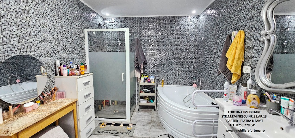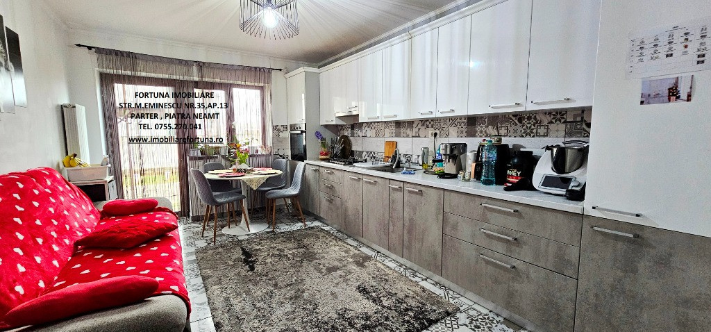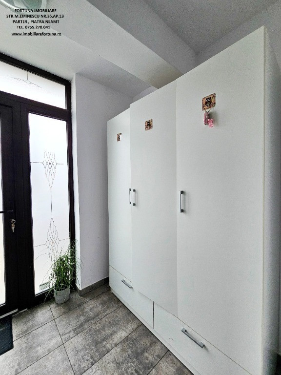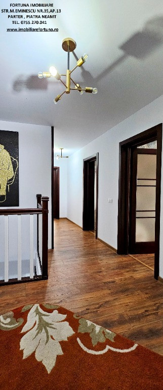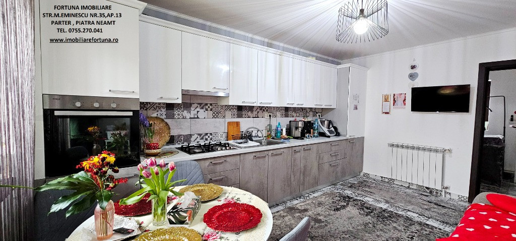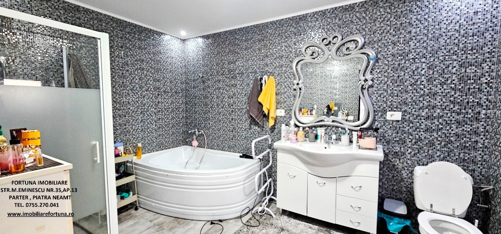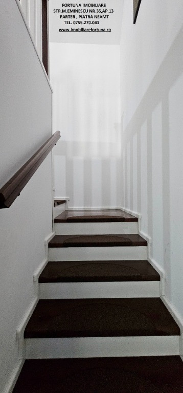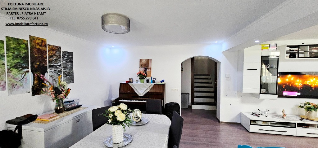 PROPRIETATE PIATRA NEAMȚ – VILĂ COCHETĂ, PREVĂZUTĂ CU BECI, TERASĂ ȘI TEREN, 215.000 EURO Pentru cei care doresc să se bucure de facilitățile urbane, beneficiind totodată de liniște, verde și aer curat, FORTUNA IMOBILIARE propune spre achiziție această proprietate elegantă, îngrijită, primitoare, compusă din casa P+M, terasă și teren, situată într-o zonă liniștită și foarte bine conectată, din intravilanul Municipiului Piatra Neamț. Proprietatea este compusă din suprafața totală de 500 mp teren, pe care este edificată o casă cu regim de înălțime P+M, cu suprafața construită la sol de 148 mp, suprafața construită desfășurată de 314 mp, pe fundații din beton armat, zidărie din cărămidă porotherm, acoperită cu tablă profilată tip Lindab, prevăzută cu termosistem exterior integral din polistiren ignifugat de 10 cm, ferestre de termopan, 2 centrale termice interconectate - una pe gaz metan, iar cealaltă „Viadrus” pe lemne, cu o capacitate de 34 kW. Casa este construită în 2021, cu accent pe confort, funcționalitate și eficiență energetică. Este compartimentată astfel: ***Parterul oferă o zonă de locuit deschisă și dinamică: hol, living generos, ce abundă în lumină naturală, dinning cu ieșire într-o terasă mare, bucătărie prevăzută cu o cămară generoasă, dormitor matrimonial prevăzut cu o baie proprie mare (dotată cu cadă și cabină de duș, grup sanitar) și camera centralei. ***Mansarda este compusă din: hol, 3 camere - fiecare cu ieșire în terasă proprie, dressing generos și baie. *** Planșeul dintre etaje precum și scara interioară sunt construite din beton armat, ceea ce asigură casei o rezistență crescută și siguranță în exploatare. Podul, pe toata suprafața casei, este izolat cu vată bazaltică de 15 cm. Ușile interioare și scara interioara sunt realizate din lemn masiv din tei. Casa beneficiază de finisaje de calitate și bun gust, răspunzând unor înalte exigențe. Este conectată la utilitățile zonei : apă, electricitate și gaz metan de la rețeaua publică. Deține fosă septică. Proprietatea asigură nu doar eleganță și confort la interior, ci și o curte frumos amenajată, organizată cu alei betonate, gazon, plante ornamentale, oferind suficient spațiu pentru a crea o atmosferă de relaxare în aer liber. Aceasta este împrejmuită cu gard solid din zidărie, cu temelie și elevație din beton armat. Preț 215.000 euro Pentru o prezentare detaliată a acestei oferte, furnizarea unor informații suplimentare referitoare la situația juridică / identificarea imobilului și programarea unei vizionări, vă invităm la sediul nostru, Fortuna Imobiliare, situat pe str. M. Eminescu, nr. 35, ap. 13, parter, lângă fostul Tribunal, tel. contact 0755.270.041. Your comfort is our priority ! Oferta noastră completă o găsiți aici: https://imobiliarefortuna.ro/