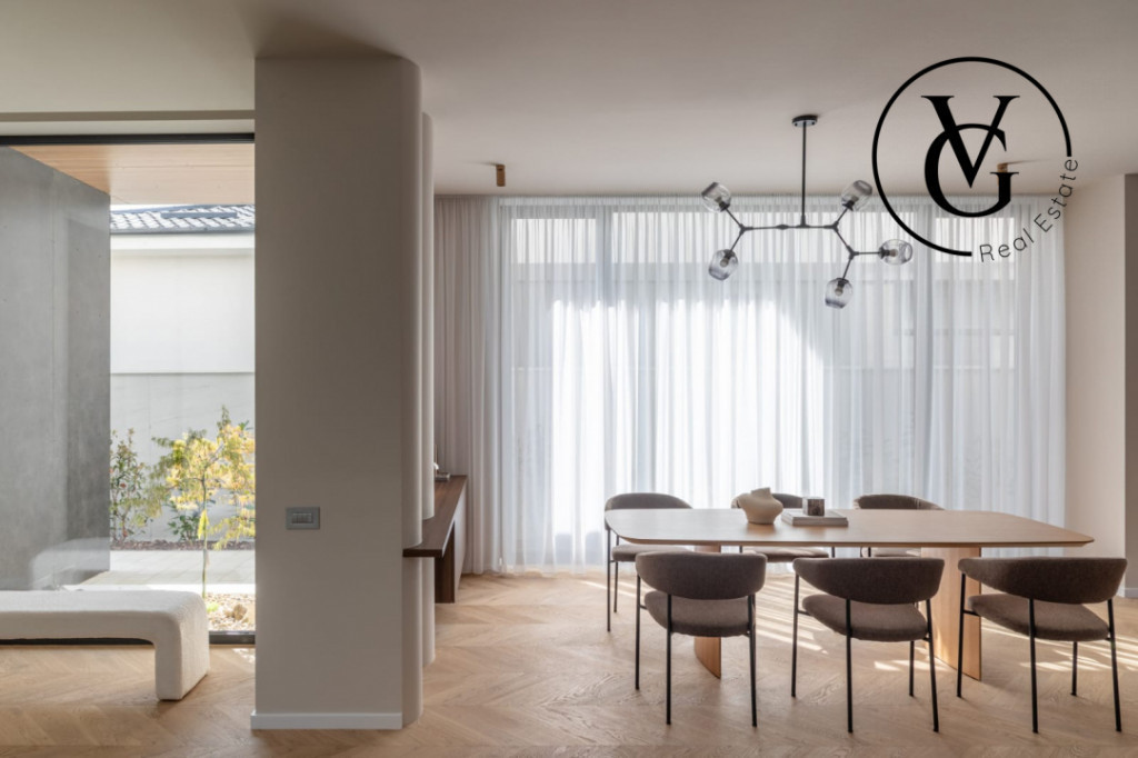 VG Real Estate vă propune spre achiziţionare o vila individuală amplasată în intr-o zonă de case, ce dispune de curte proprie, piscina incalzita, spalatorie, 1 garaj, 2 terase acoperite si 3 locuri de parcare in curte! LOCALIZARE: Vila este poziţionată in zona Pipera, in zona de Nord a Capitalei, o zona pe care o vei indragi din prima pentru ca reuseste sa te scoata din haosul cotidian si sa-ti ofere o stare de liniste si relaxare. COMPARTIMENTARE: Proprietatea este dispusă pe cinci camere, după cum urmează: La parter: - Livingul 55 mp - Bucătăria pe o suprafaţă generoasă 22 mp - Accesul către terasa acoperita, piscina incalzita cu grup sanitar propriu şi grădina proprie. - Camera tehnica sau spatiu de depozitare - Un grup sanitar La etajul 1: - Patru dormitoare dintre care unul matrimonial cu dressing de 26mp si baie proprie de 9 mp - Trei bai FINISAJE SI DOTĂRI: Tamplaria este din aluminiu cu geamuri tripan cu protectie solara,incalzire in pardoseala de la Uponor automatizata pe fiecare camera individual cu control prin telefon,racire si incalzire prin unitati de aer conditionat din tavan, parchet chevron triplistratificat, fatada ventilata cu HPL,priza de 380 pentru incarcare masini electrice in garaj, piscina incalzita si gradina amenajata Preț: 1.850.000 € Pentru mai multe detalii și vizionări, nu ezitați să ne contactați! Id intern: P142887