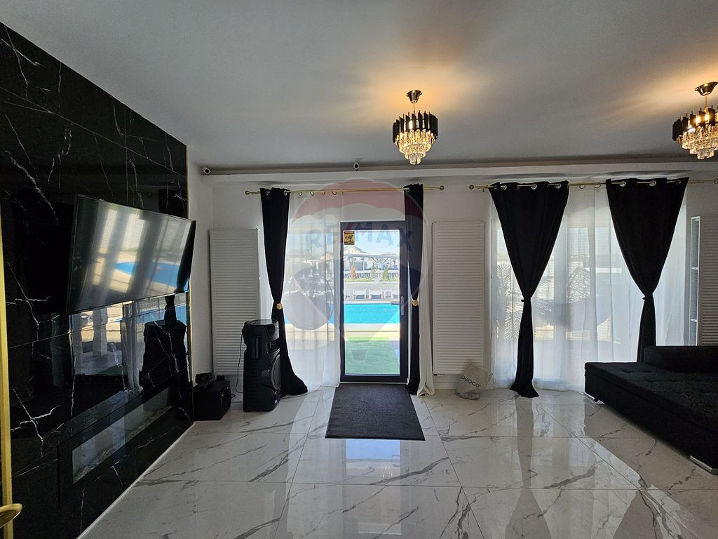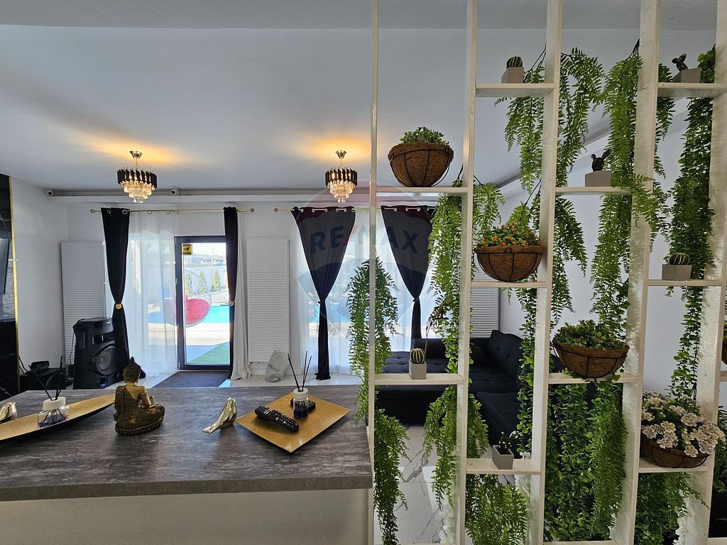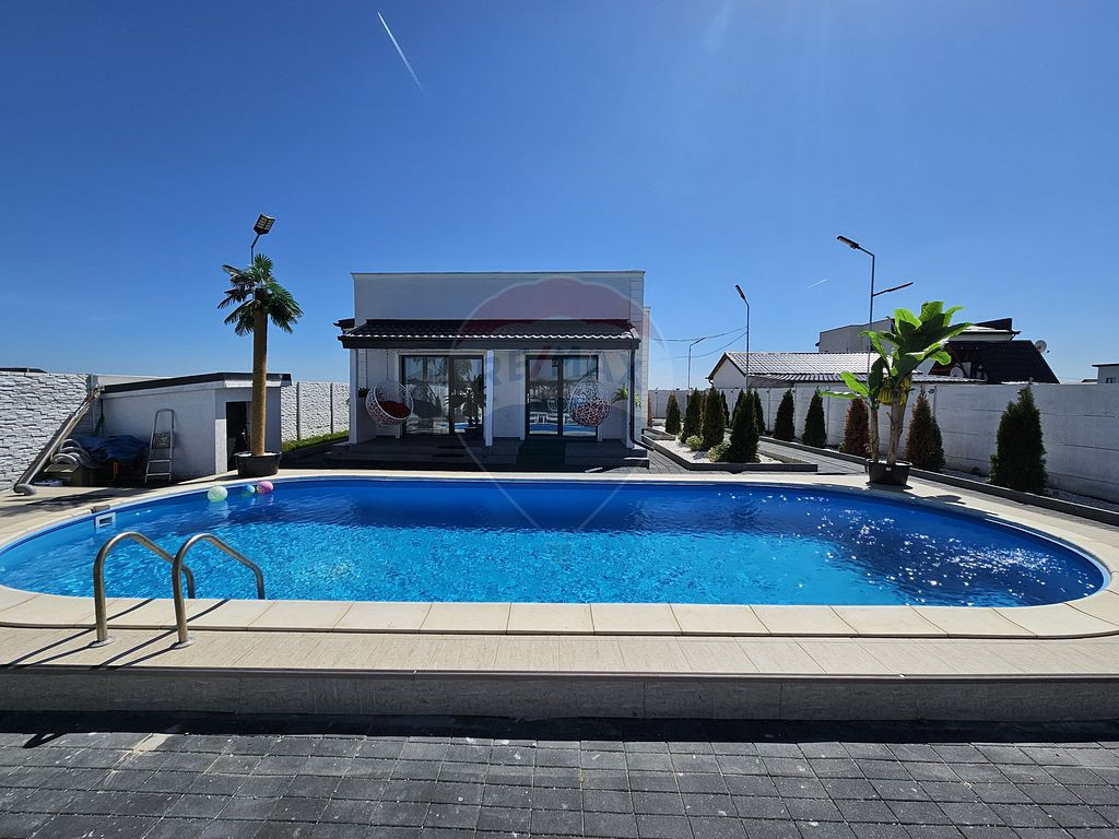 Va oferim spre vanzare o vila de 4 camere regim de inaltime parter +pod, in suprafata de 114 mp utili , cu terasa acoperita de 100 mp si grupuri sanitare exterioare piscinei, piscina cu dimensiune de 10m×5m ×1,5 m si teren intravilan total 1550 mp! Frumoasa vila este o execelenta imvestitie atata ca si vila de locuit cat si ca vila cu petreceri organizate pentru ca are parcare amenajata , terasa acoperita , terasa deschisa , grupuri sanitare exterioare piscinei, teren de tenis care este in amenajare , palmieri langa piscina , iar la interior vila este complet mobilata si utilata delux! Vila este compusa din living cu bucatarie open space, 3 dormitoare. 2 bai, hol.mare toate complet mobilate si utilate! Super imvestitie! Va asteptam la vizionare!