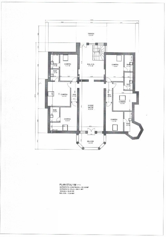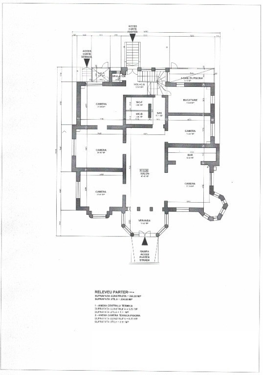 Proprietate deosebită situată pe Strada Vasile Alecsandri nr. 11, într-o zonă centrală și bine cotată a municipiului Câmpina, cu acces facil către principalele puncte de interes ale orașului. Imobilul se remarcă prin suprafața mare de teren, compartimentarea eficientă și posibilitatea de utilizare atât rezidențială, cât și comercială. Date generale • Suprafață teren: aproximativ 2.150 mp • Construcție principală: demisol + parter + etaj • Suprafață construită parter: 269,83 mp • Suprafață utilă parter: 204,85 mp • Suprafață construită etaj: 251,52 mp • Suprafață utilă etaj: 204,11 mp • Suprafață construită demisol: 144,51 mp • Suprafață utilă demisol: 92,64 mp • Anexe: o Anexa C2 – suprafață construită 102,17 mp, suprafață utilă 81,95 mp o Cameră tehnică piscină și centrală termică • Piscină exterioară: suprafață utilă aproximativ 69 mp • Terase, balcon și verandă cu suprafețe generoase Compartimentare Construcția principală este bine structurată, cu camere de mari dimensiuni, saloane generoase și circulații clare între zonele de zi și de noapte. Parterul dispune de un salon spațios, bucătărie separată, mai multe camere ce pot fi utilizate ca dormitoare sau birouri, grupuri sanitare și zone de socializare, cu acces direct către exterior. Etajul oferă un al doilea salon, dormitoare luminoase cu băi proprii, precum și acces către terasă și balcon. Demisolul include camere bine ventilate, grup sanitar și spații cu multiple posibilități de utilizare, precum depozitare, birouri, spații tehnice sau locuire auxiliară. Anexa C2 este o construcție separată, cu camere proprii, baie, hol și terase, potrivită pentru locuință independentă, personal auxiliar sau activitate distinctă. Curte și exterior Curtea este amplă, cu deschidere generoasă, oferind intimitate și posibilitatea de amenajare a unor zone de relaxare, grădină sau evenimente. Piscina exterioară completează caracterul premium al proprietății. Localizare Imobilul este amplasat într-o zonă centrală a orașului Câmpina, în apropiere de unități medicale, școli, grădinițe, magazine, restaurante și transport public, cu acces rapid către principalele artere urbane. Destinații posibile Proprietatea este potrivită pentru: • reședință de familie cu suprafețe generoase; • sediu de firmă, birouri sau clinică medicală; • centru educațional sau de îngrijire; • investiție imobiliară cu funcțiune mixtă.