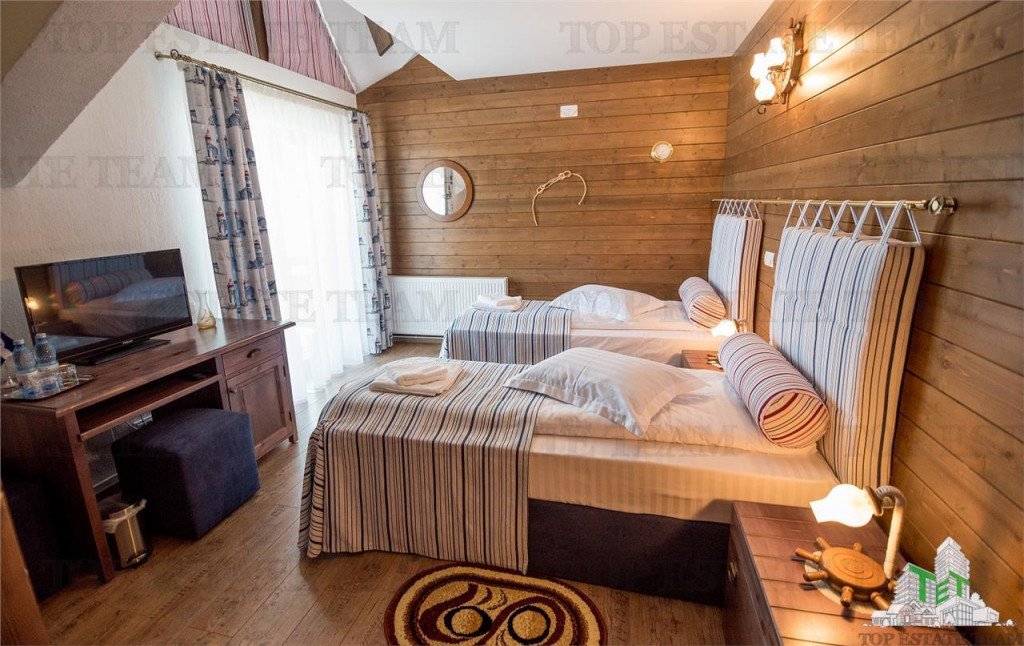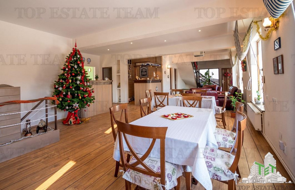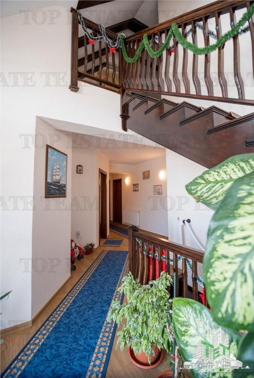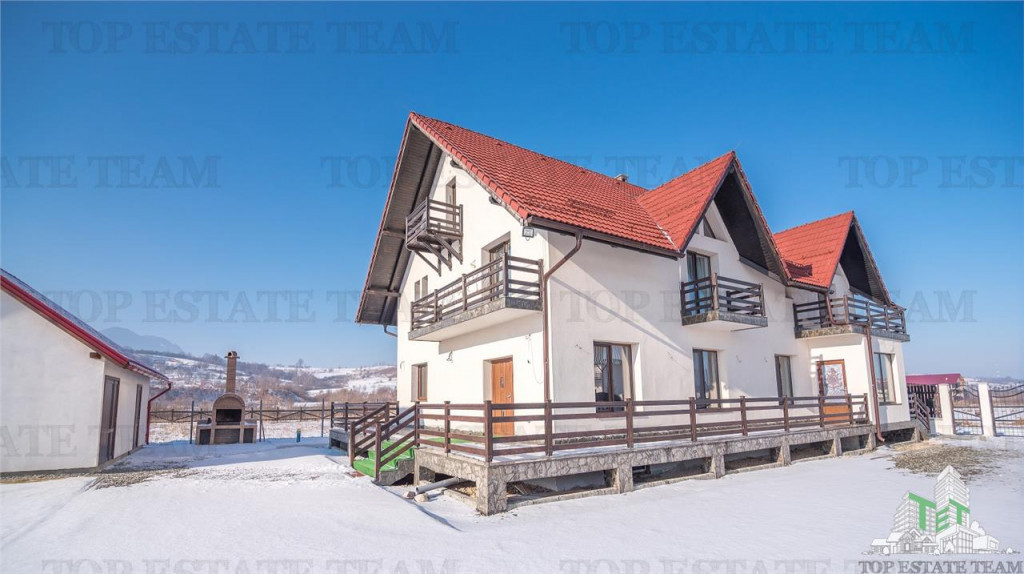 Excelenta prin experienta! Oportunitate de investitie - Vila de lux situata in Tohanul Nou ndash; Bran, la doar 200 m de DN73 Brasovndash;Pitesti (acces pe drum privat). Proprietatea ofera un peisaj superb, cu vedere panoramica spre Castelul Bran (Sud), Muntii Bucegi (Est), Muntii Piatra Craiului (Vest) si Curmatura Magurii (Nord). Constructie finalizata in 2012, vila are o suprafata desfasurata de 505 mp si un teren generos de 1.004 mp. Este complet mobilata si amenajata in stiluri de design variate, cu o amprenta de inspiratie marinareasca. Compartimentare: Subsol (40 mp): beci si spatiu de depozitare (sau potentiala crama). Parter: living spatios de 75 mp, bucatarie complet utilata cu electrocasnice premium, dormitor matrimonial cu dressing si baie proprie, grup sanitar de serviciu, debara si camera tehnica. Etaj: trei camere si un apartament cu living si dormitor, fiecare camera dispunand de baie proprie si balcon. Fiecare spatiu este decorat intr-un stil distinct: grecesc, oriental, nordic si tematica marinareasca. Mansarda: apartament cu living open space si bucatarie, dormitor, baie si balcon, plus o camera separata cu baie si balcon propriu. Incalzirea si apa calda sunt asigurate de o centrala pe peleti, insa conducta de gaz se afla la poarta, oferind posibilitatea de racordare rapida la reteaua de gaz. Curte: magazie de 60 mp, gratar generos, spatiu verde de peste 250 mp si locuri de parcare pentru 6 masini. Vila se vinde la cheie, la pretul de 480.000 euro (negociabil). Ideala pentru investitie, locuinta de vacanta sau includere in circuitul turistic. Pentru orice alte detalii, va stau la dispozitie! ID intern: TET0014918.