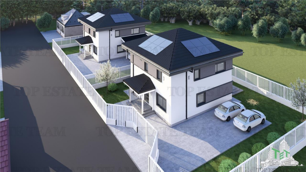 Excelenta prin experienta ! Noi nu vindem francize, noi vindem proprietati... si o facem pe 5 continente ! Oferta promotionala de sarbatori ! Va propunem spre vanzare un Complex Nou de Vlle Independente Energetic, dotat cu panouri fotovoltaice ( contract de prosumator 15KW ) format din 4 locuinte individuale, situat langa Padurea Snagov, foarte aproape de lac Regimul de inaltime este de P 1 M, iar compartimentarea este urmatoarea: La parter gasim un living cu bucatarie inchisa/deschisa, dressing, grup sanitar, camera tehnica cu spatiu de depozitare generos si holul de acces. Accesul in garaj se realizeza direct din interiorul vilei. La etaj se afla un dormitor matrimonial cu dressing si baie proprie si inca 2 dormitoare deservite de o baie. Caracteristicile de baza ale proprietatii sunt urmatoarele: Suprafata utila: 172 mp Suprafata construita: 255 mp Suprafata teren: 500 mp cu cota drum privat acces Nr. camere: 5 Nr dormitoare: 3 Nr. bucatarii: 1 Nr. bai: 3 Nr. terase: 2, 44,5mp respectiv 5,1mp Nr balcoane: 2 Nr. locuri de parcare: 2 Dotari : - trotuare si terasa placate cu granit -panouri fotovoltaice 15KW acumulatori 7KW -pompe de caldura Daikin -acoperis metalic tip tigla -sistem aspiratie automata preinstalata -sistem ventilare cu aport de aer proaspat centralizat -instalatie de incalzire in pardoseala cu pompa de caldura reversibila; -instalatie de racire in tavane recilculabil -sistem automat de control al casei de la distanta; -izolatii termice la exterior cu polistiren expandat de 15cm -pereti metalici izolati cu:vata bazaltica de mare densitate, faianta, lavabil; - podele: parchet, gresie; -ferestre din PVC Rehau cu geam tripan -usa intrare Pinar placata la exterior cu ceramica -rulouri electrice la toate geamurile controlate de la distanta -balustrada exterioara din sticla; -tip curte: individuala; Anul constructiei este 2025 Utilitati generale: curent electric, apa , canalizare prin racordarea la reteau localitatii Snagov, internet si put pentru gradina ID intern: TET0020795.
