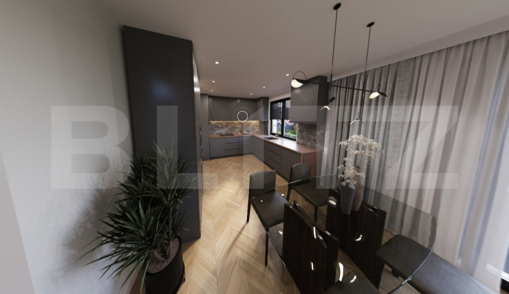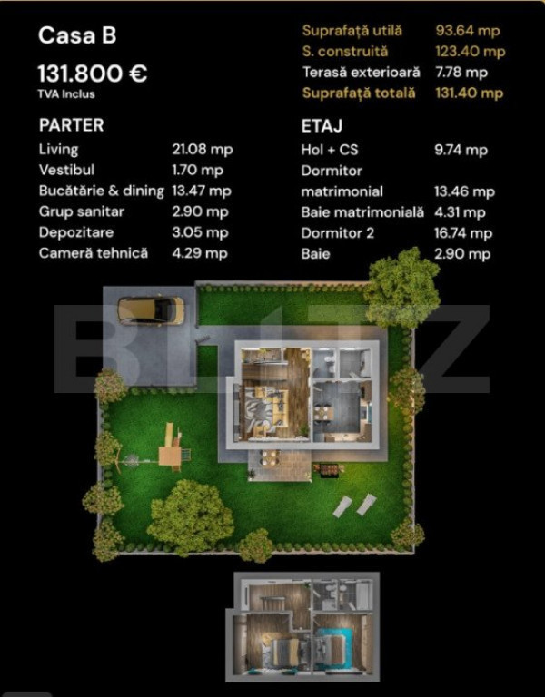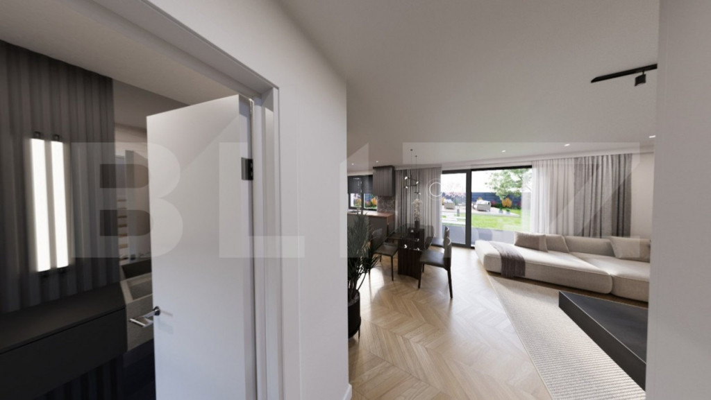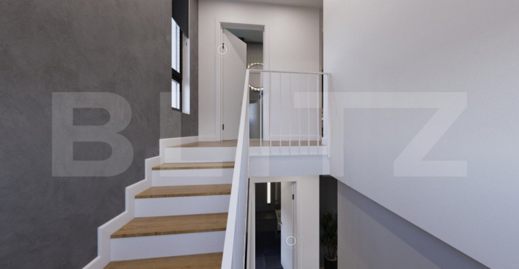 Blitz va propune spre vanzare casa individuala cu regim de inaltime P+1E cu trei camere si teren in PRIMUL CARTIER “VERDE”, la aproximativ 10 minute de centrul orasului. Locuința este dotată cu pompă de căldură sol-apă cu foraj de adâncime cu circuit închis, ce asigură în mod eficient încălzirea locuinței prin pardoseală și prepararea apei calde menajere, dar și răcirea pasivă a casei în lunile de vară si este branșată la rețeaua publică de alimentare cu apă și canalizare. In plus, ca parte din dotarea standard, vor fi instalate panouri fotovoltaice de aproximativ 6kw astfel incat sa poti deveni prosumator si implicit consum net anual de energie aproape de zero. Suprafața construită a locuintei este de aprox. 123 mp, dispusa astfel: - Parter: vestibul, living, bucatarie&dining, grup sanitar, spatiu depozitare, camera tehnica - Etaj : hol,dormitor matrimonial cu baie, dormitor, baie; Terasa exterioara este de aprox. 8 mp. Suprafața totala a locuinței este de circa 132 mp. Dispune de loc de parcare amenajat iar pentru cei care își doresc acest lucru, este disponibilă și opțiunea achiziționării unui garaj închis simplu sau dublu, cu ușă automată. Locuinta este in faza de finalizare finisaje, imaginile fiind cu titlu de prezentare. Pentru detalii suplimentare si programare vizionare va stam la dispozitie. Cod ofertă / ID BLITZ: P127985 Id intern: P127985